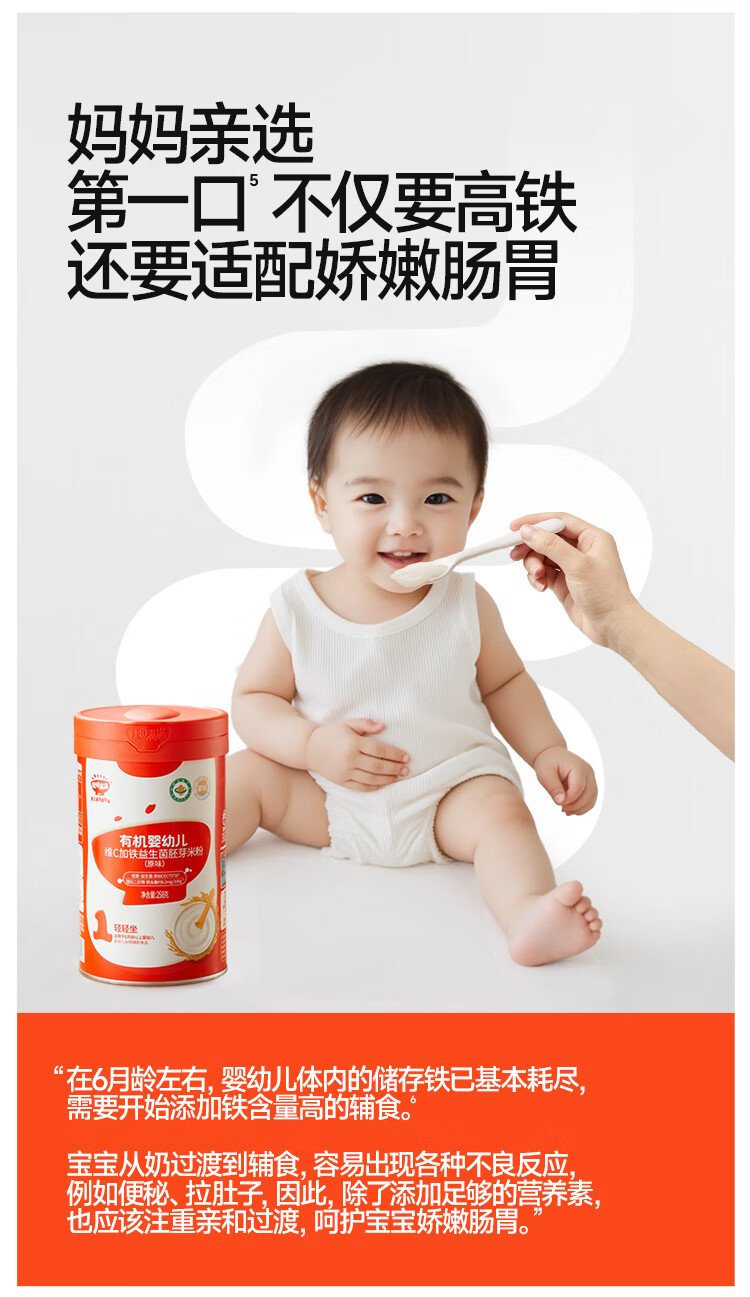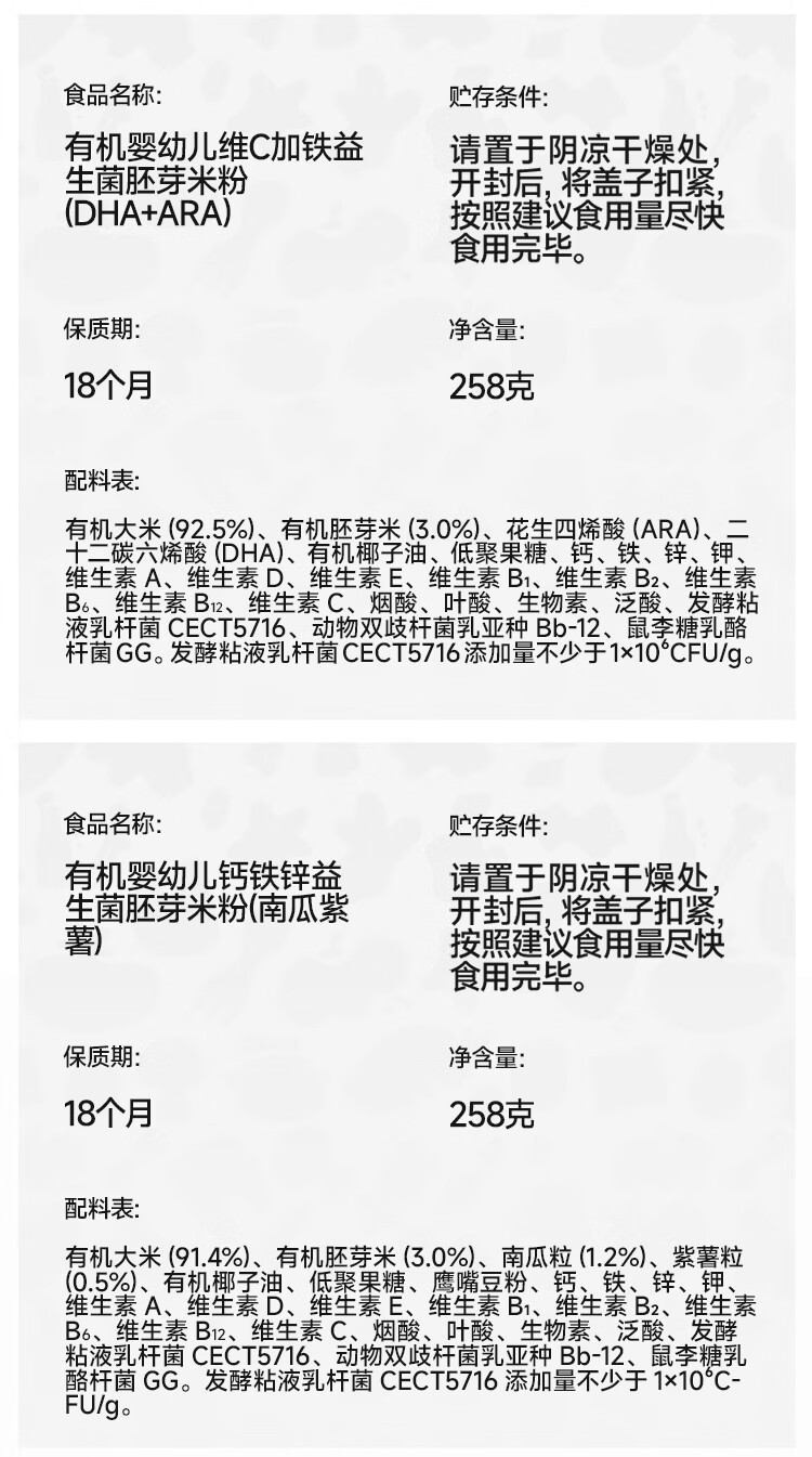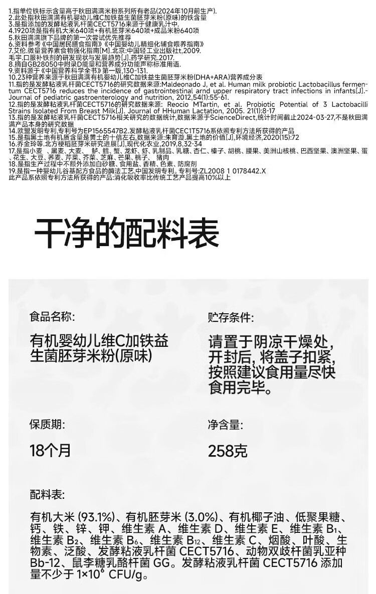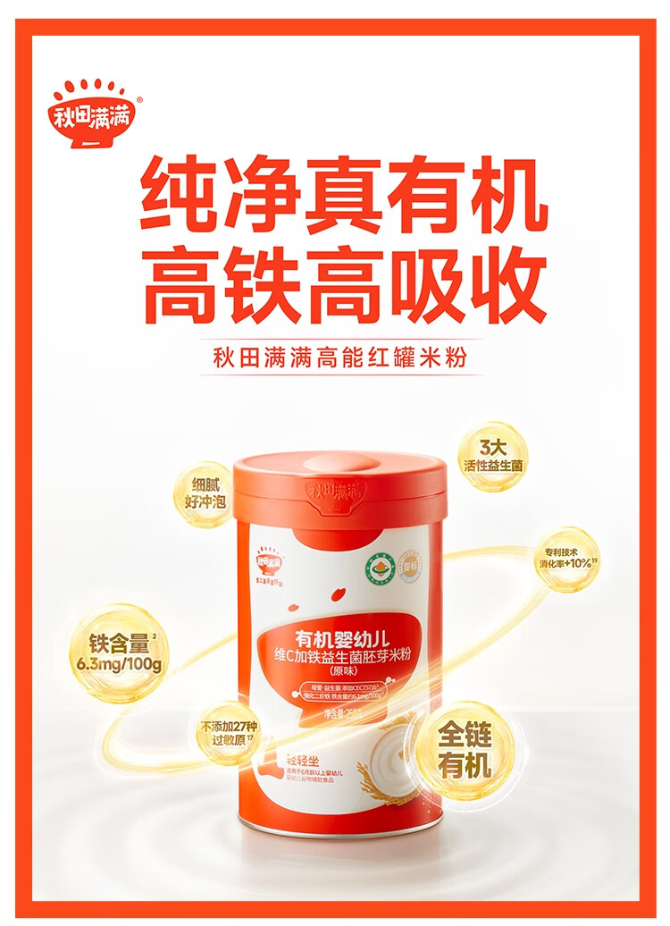 秋田满满 有机婴幼儿高铁米粉 婴儿胚芽米益生菌米糊6个月以上宝宝辅食 1阶-胚芽米原味 258g*1罐