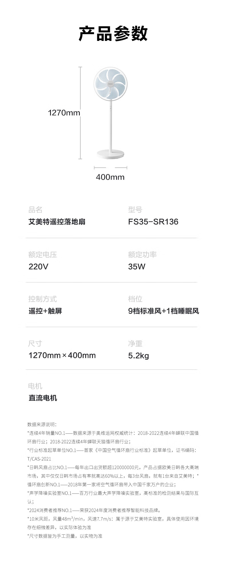艾美特(AIRMATE)2026新款电风扇家用大风量智能遥控卧室轻音直流变频落地扇七叶空气循环摇头节能小风扇FS35-RD136
