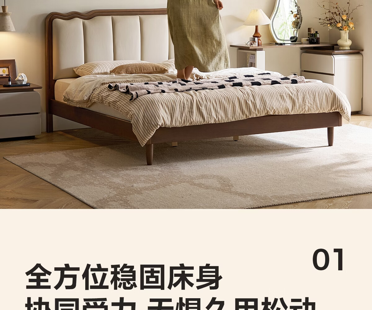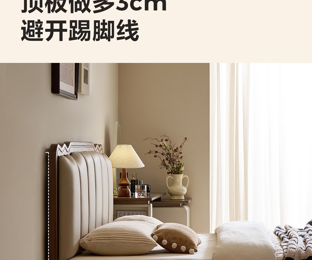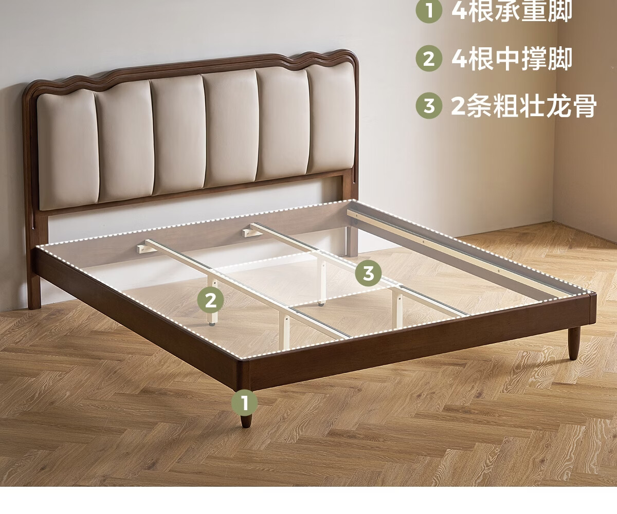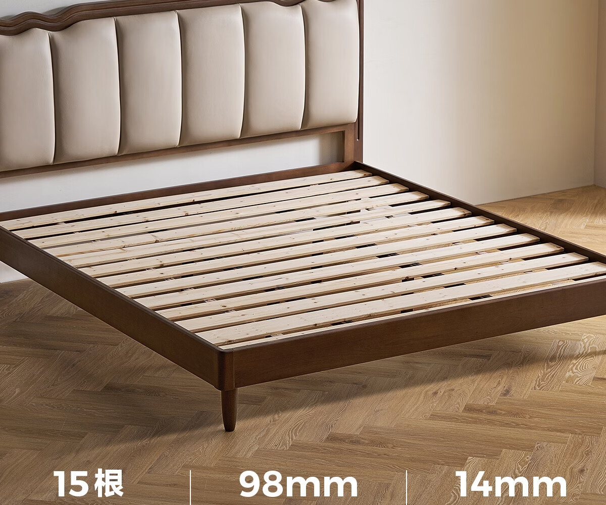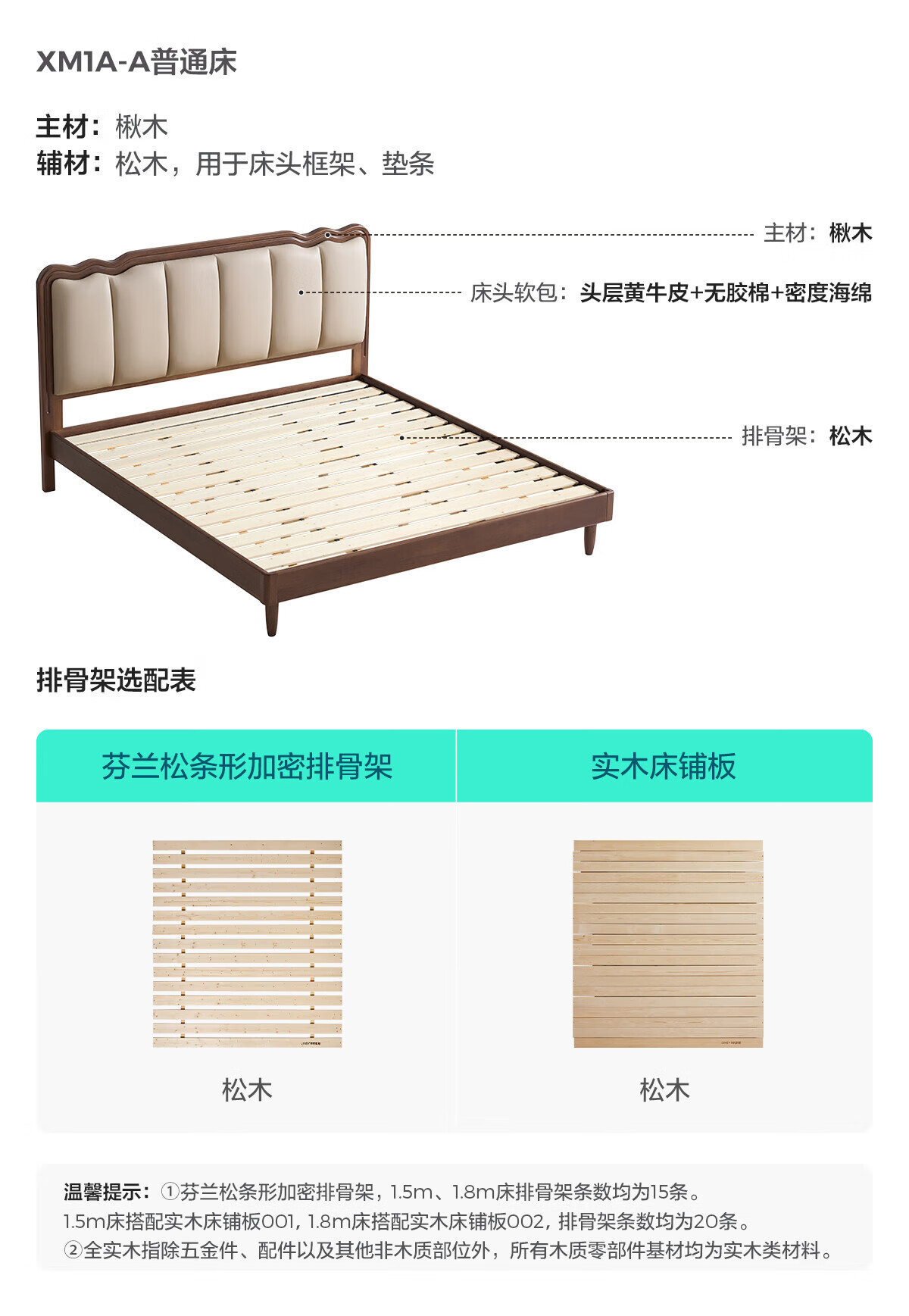林氏家居中古奶油风实木床复古真皮软包床1米8双人床家具序楸系列XM1A 排骨架【楸木】软包实木床 1.5米x2米