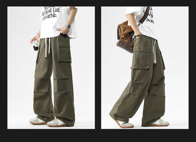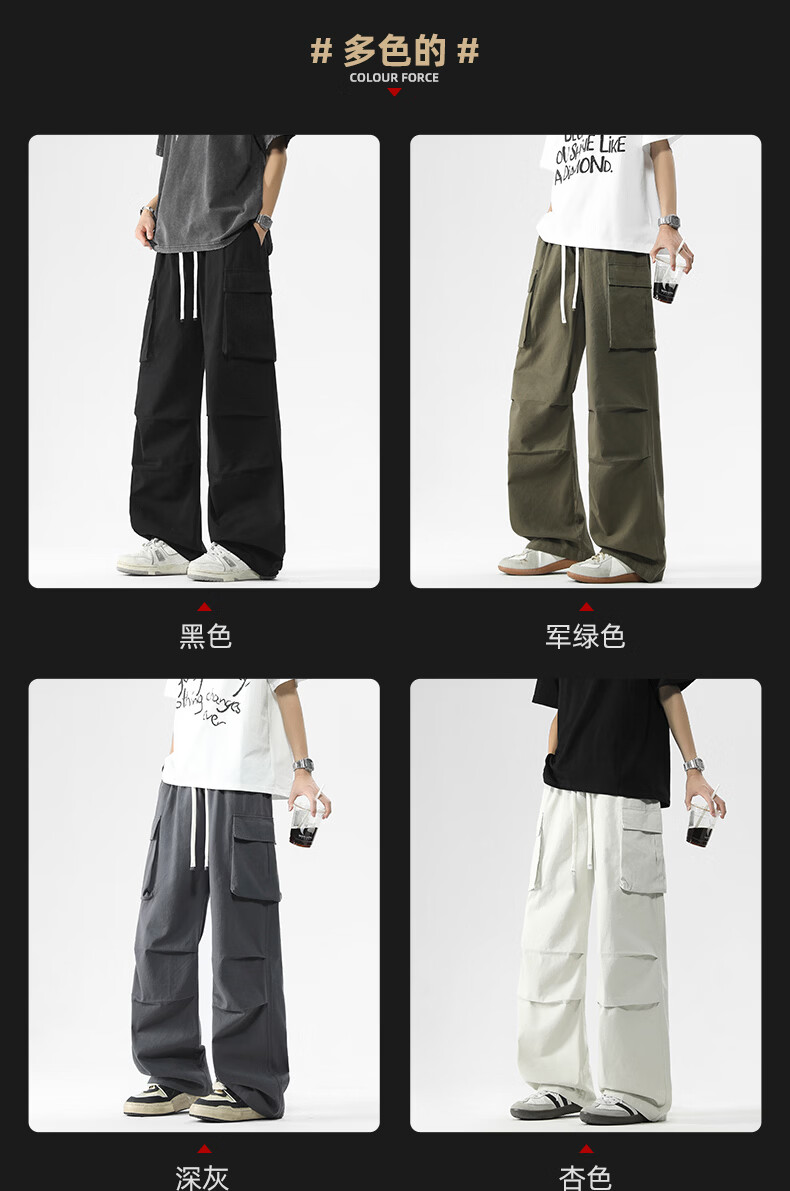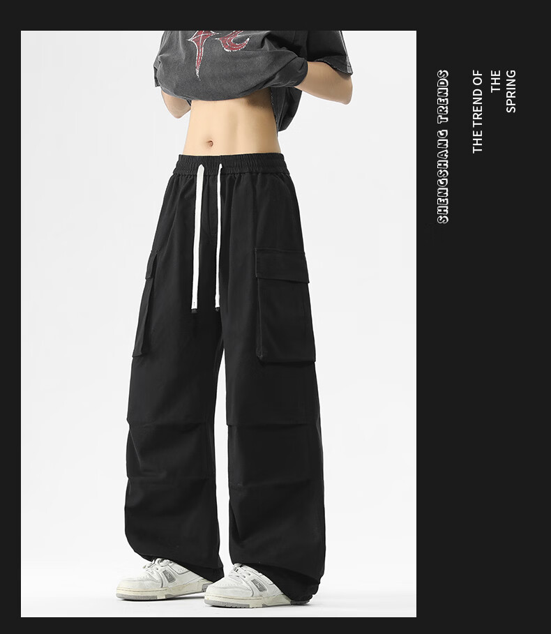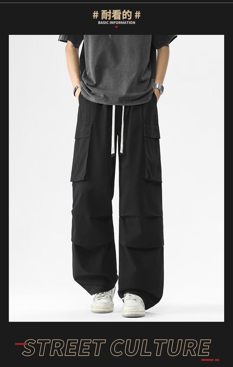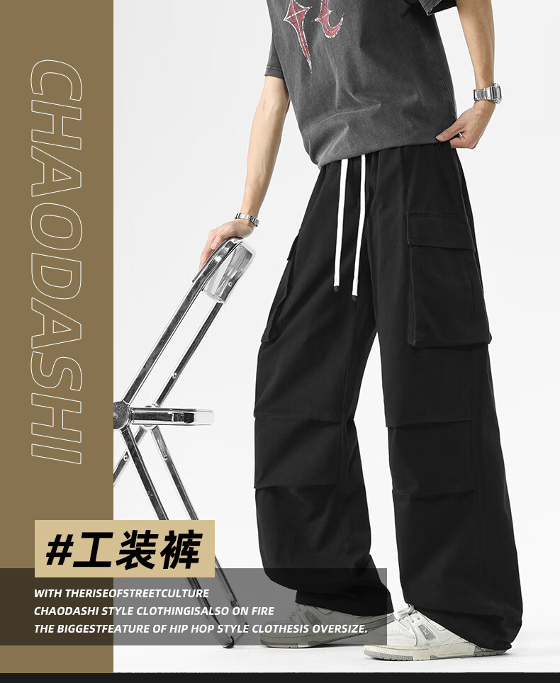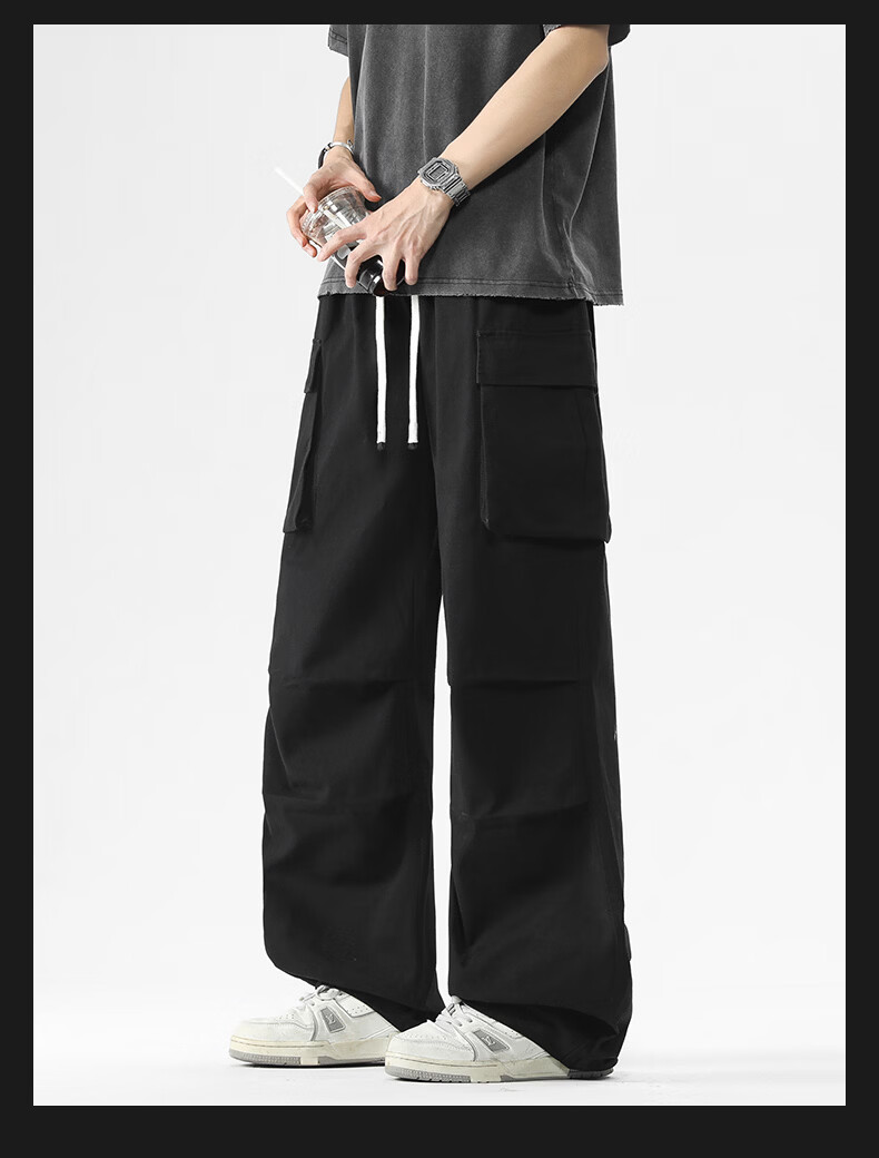 真维斯美式复古褶皱大口袋工装裤男士新款高街纯棉宽松潮流直筒休闲长裤 黑色 M