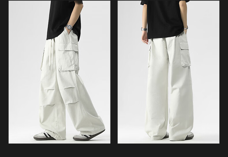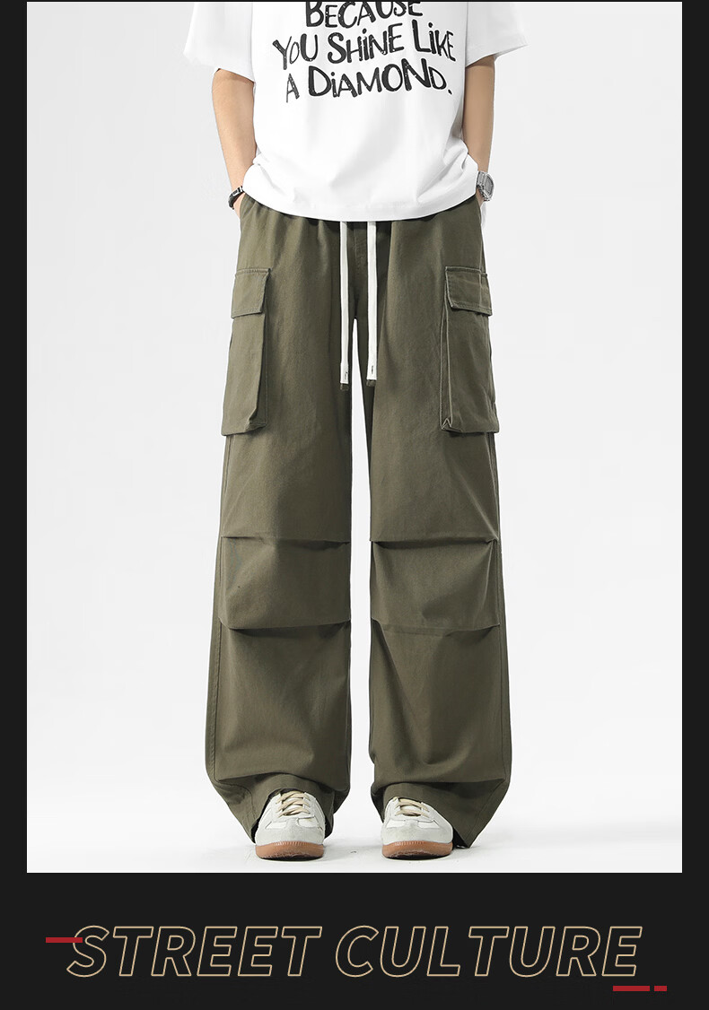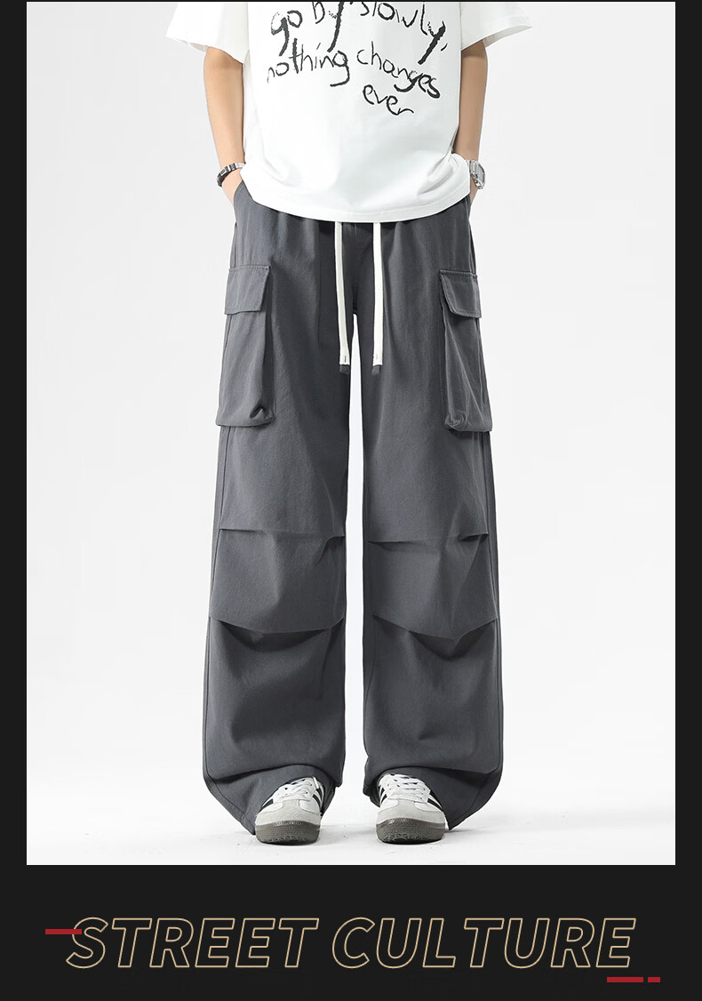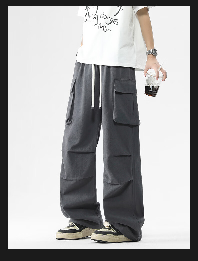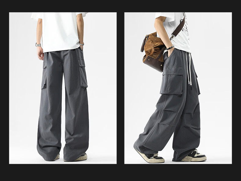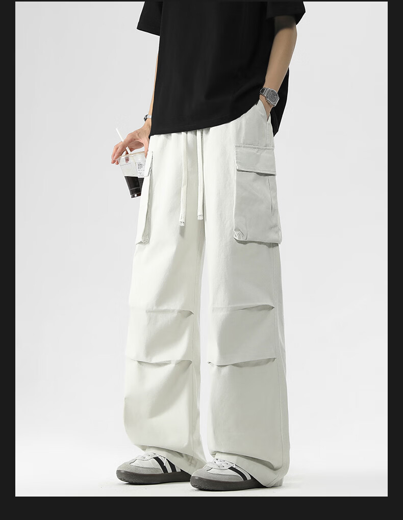 真维斯美式复古褶皱大口袋工装裤男士新款高街纯棉宽松潮流直筒休闲长裤 黑色 M