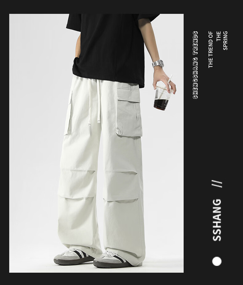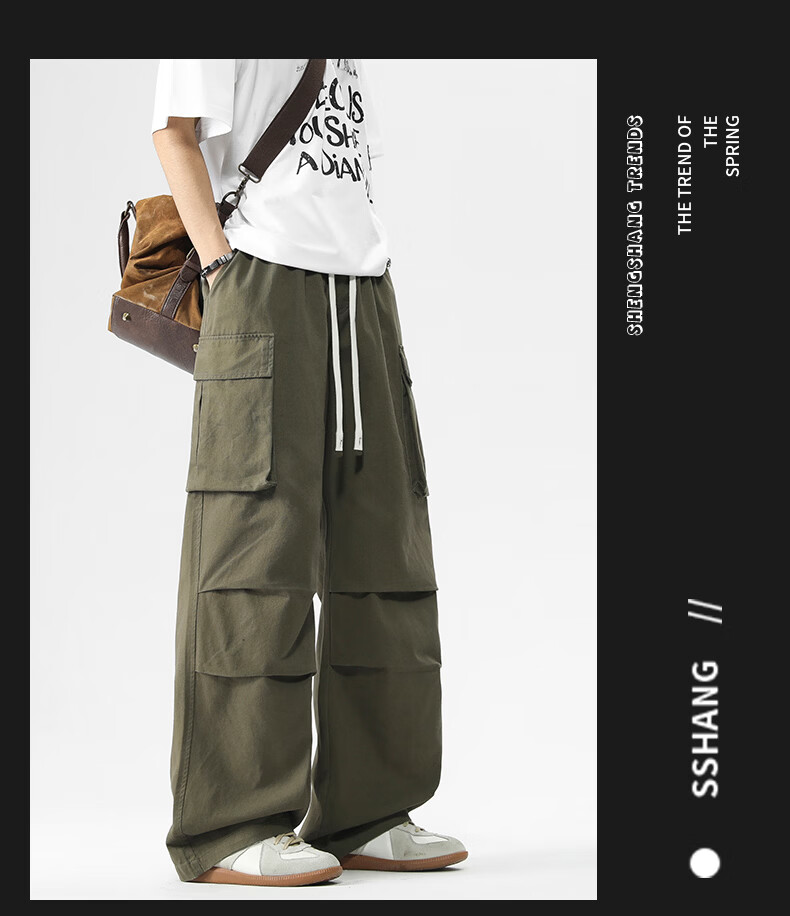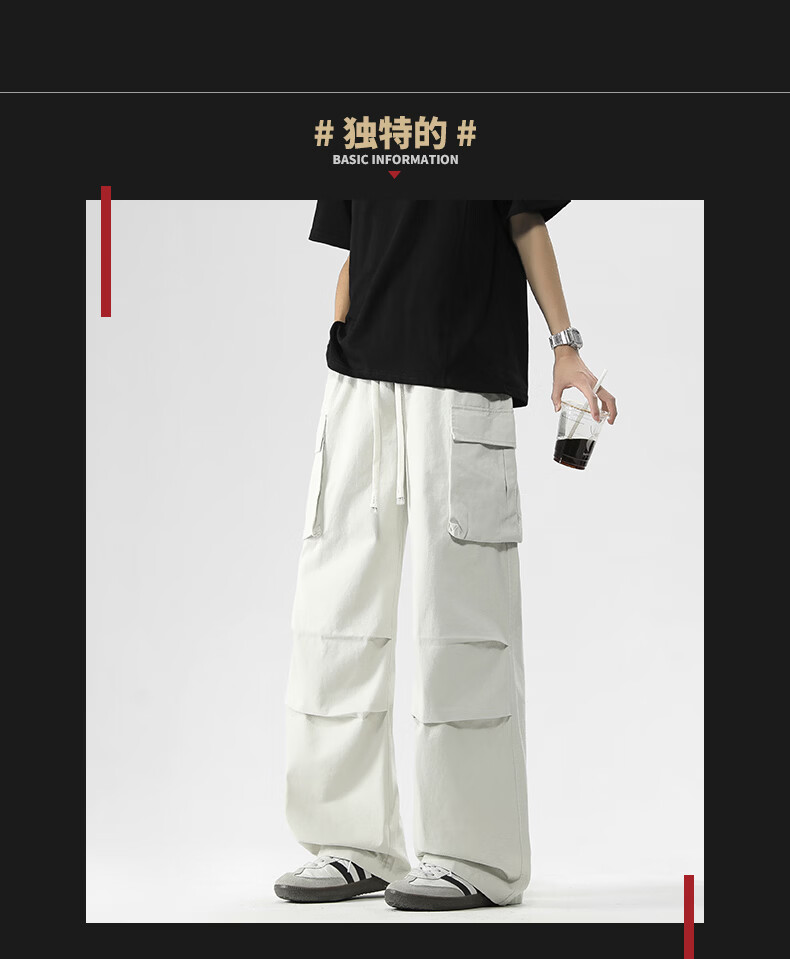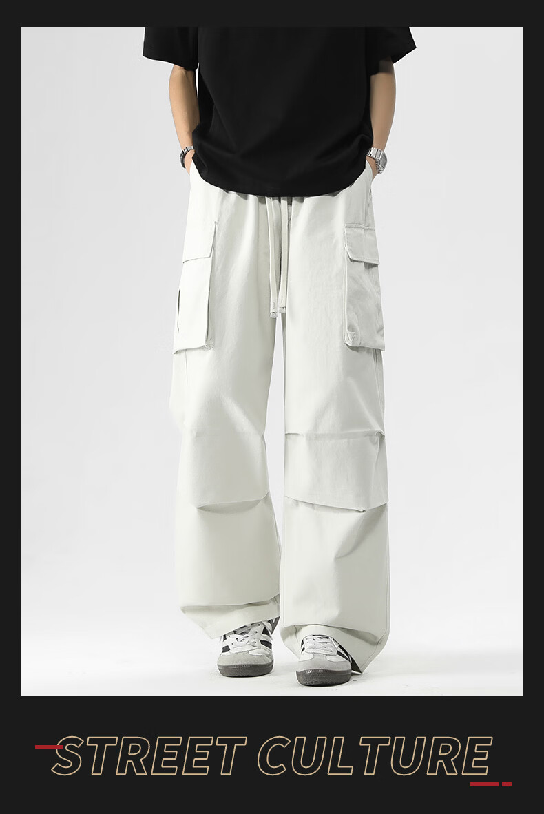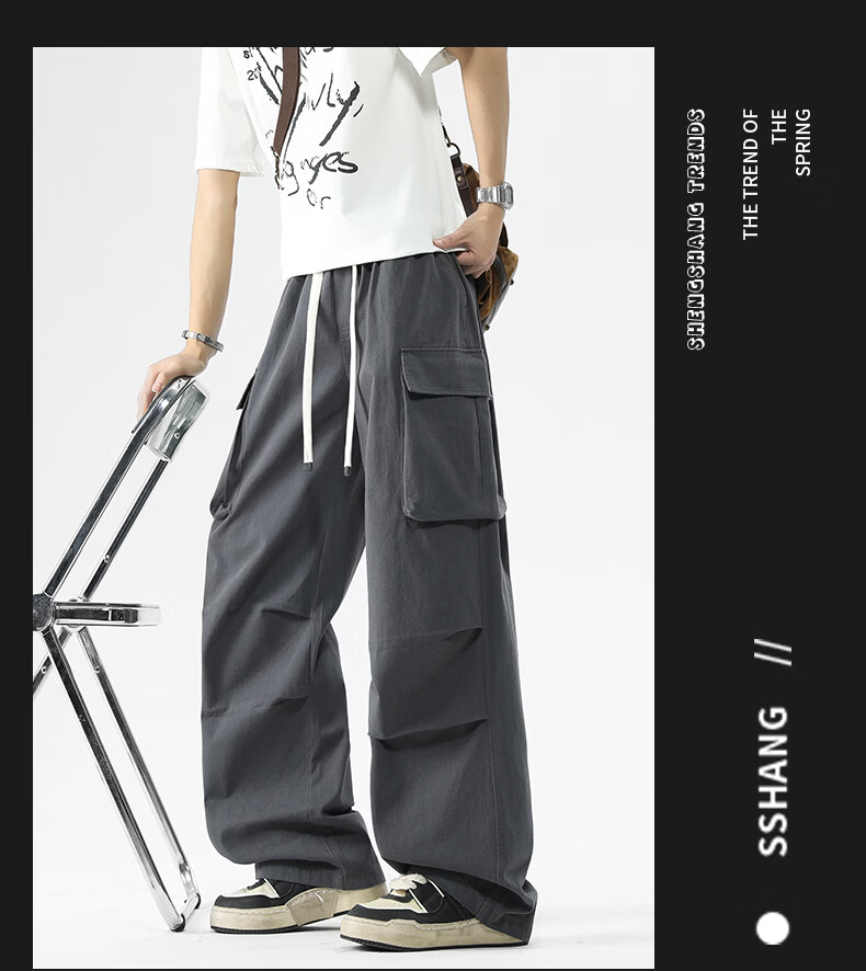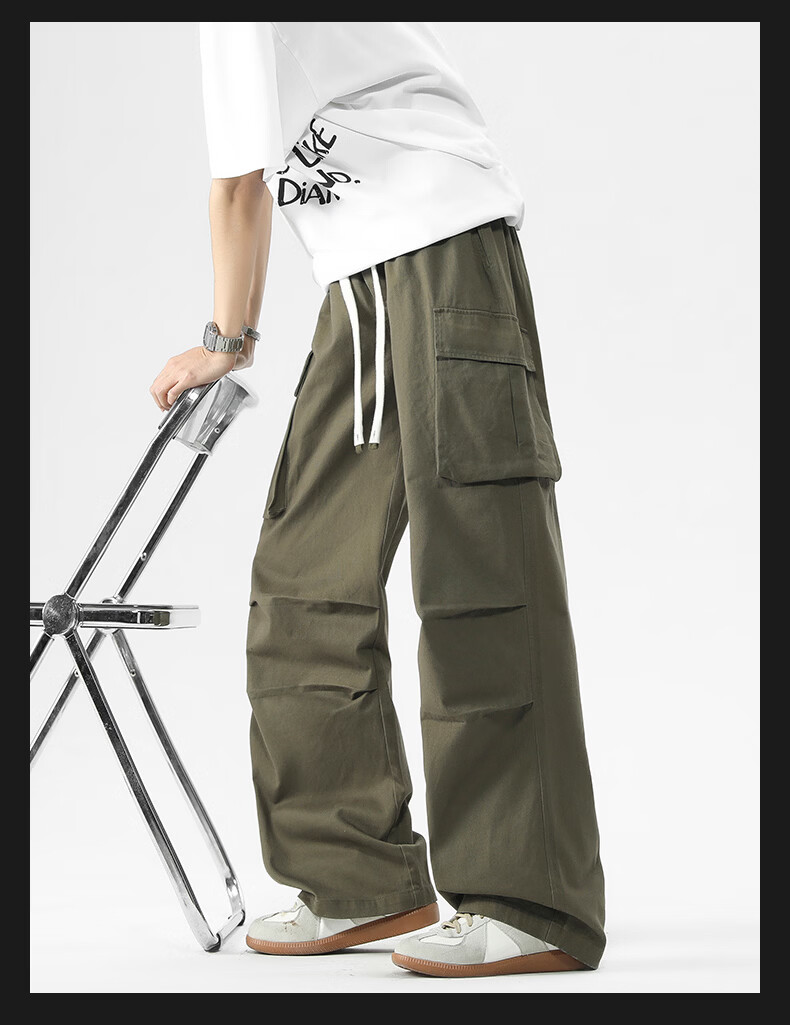 真维斯美式复古褶皱大口袋工装裤男士新款高街纯棉宽松潮流直筒休闲长裤 黑色 M