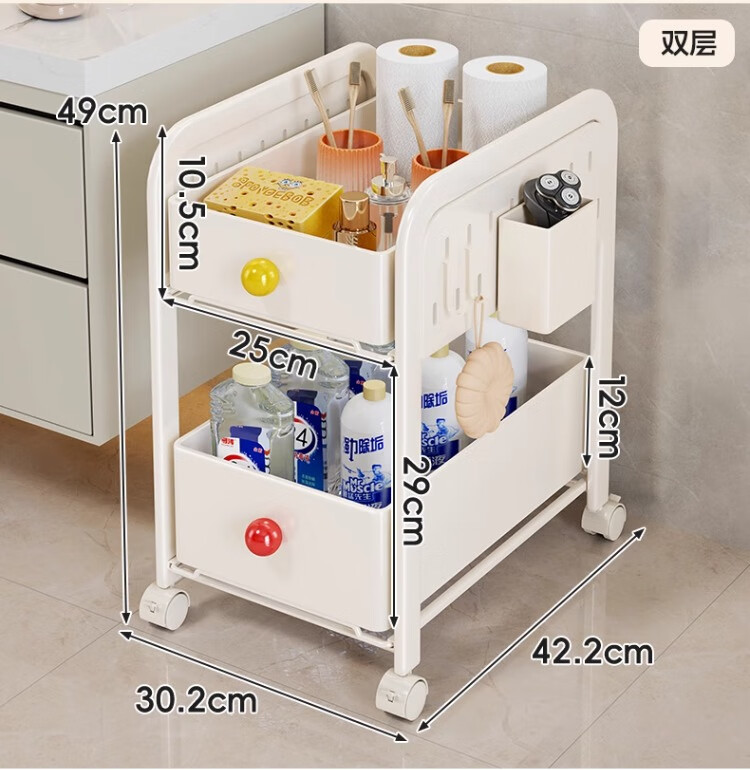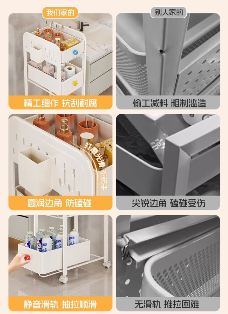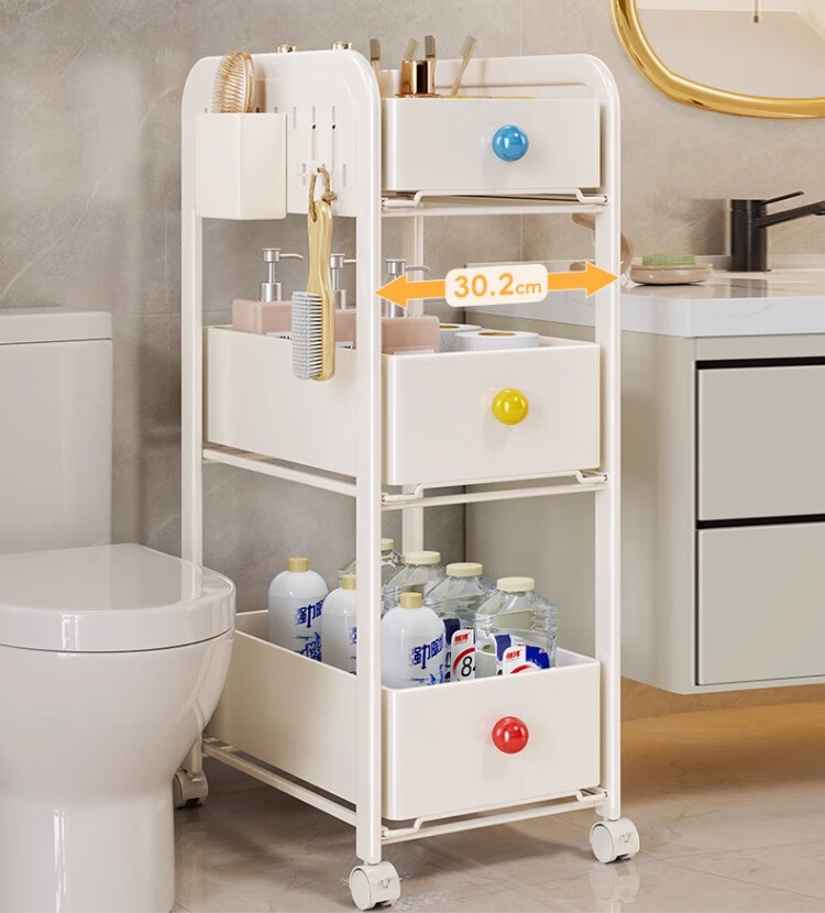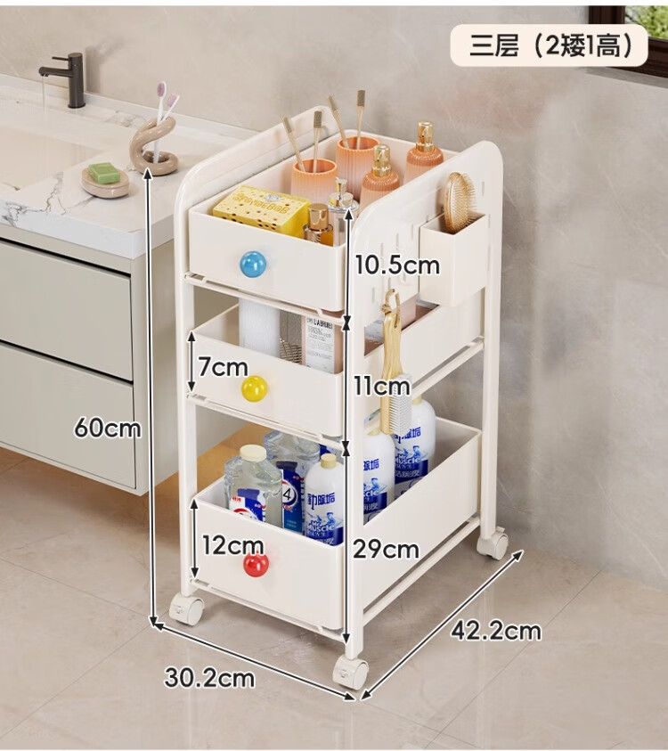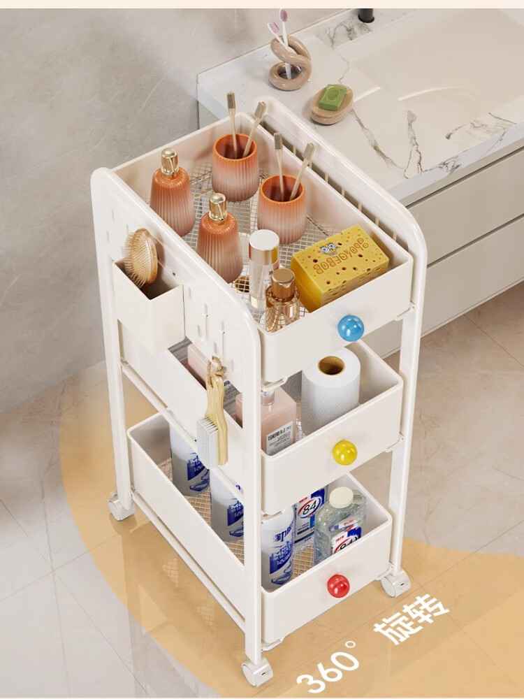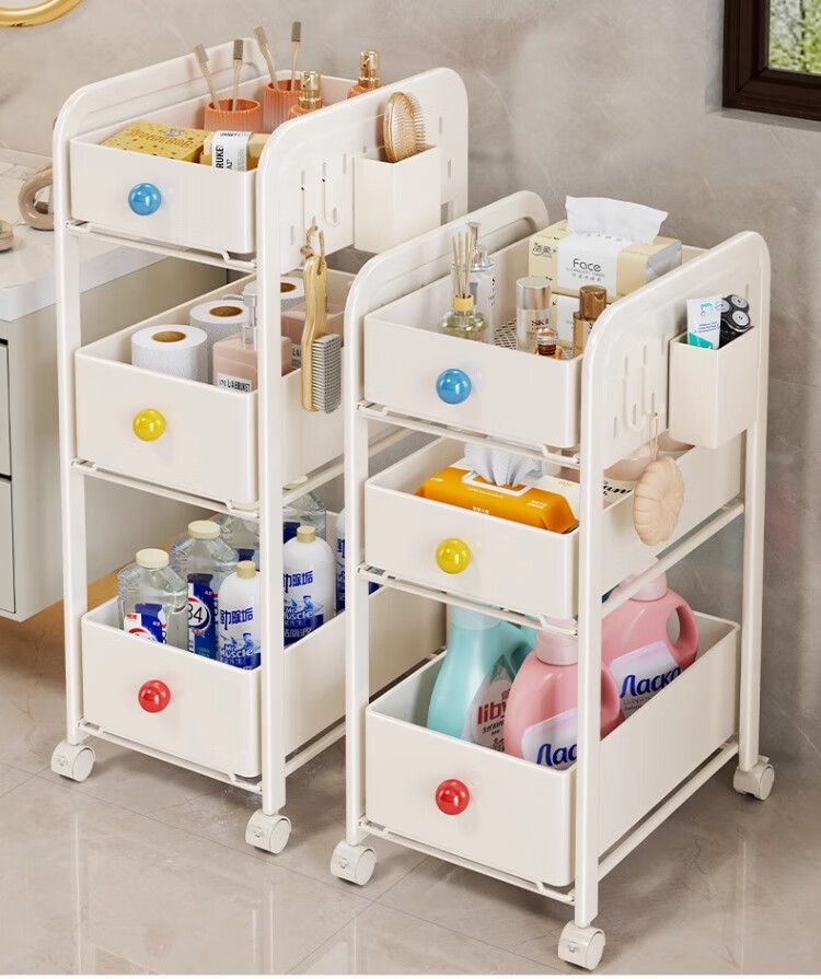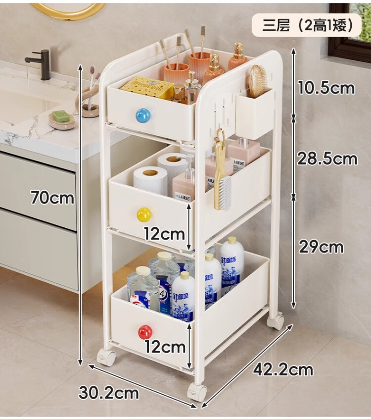 尔思家小推车置物架多层收纳架卧室卫生间落地夹缝储物架可移动零食架 三层奶白色(2高1矮)送2挂钩+1笔筒