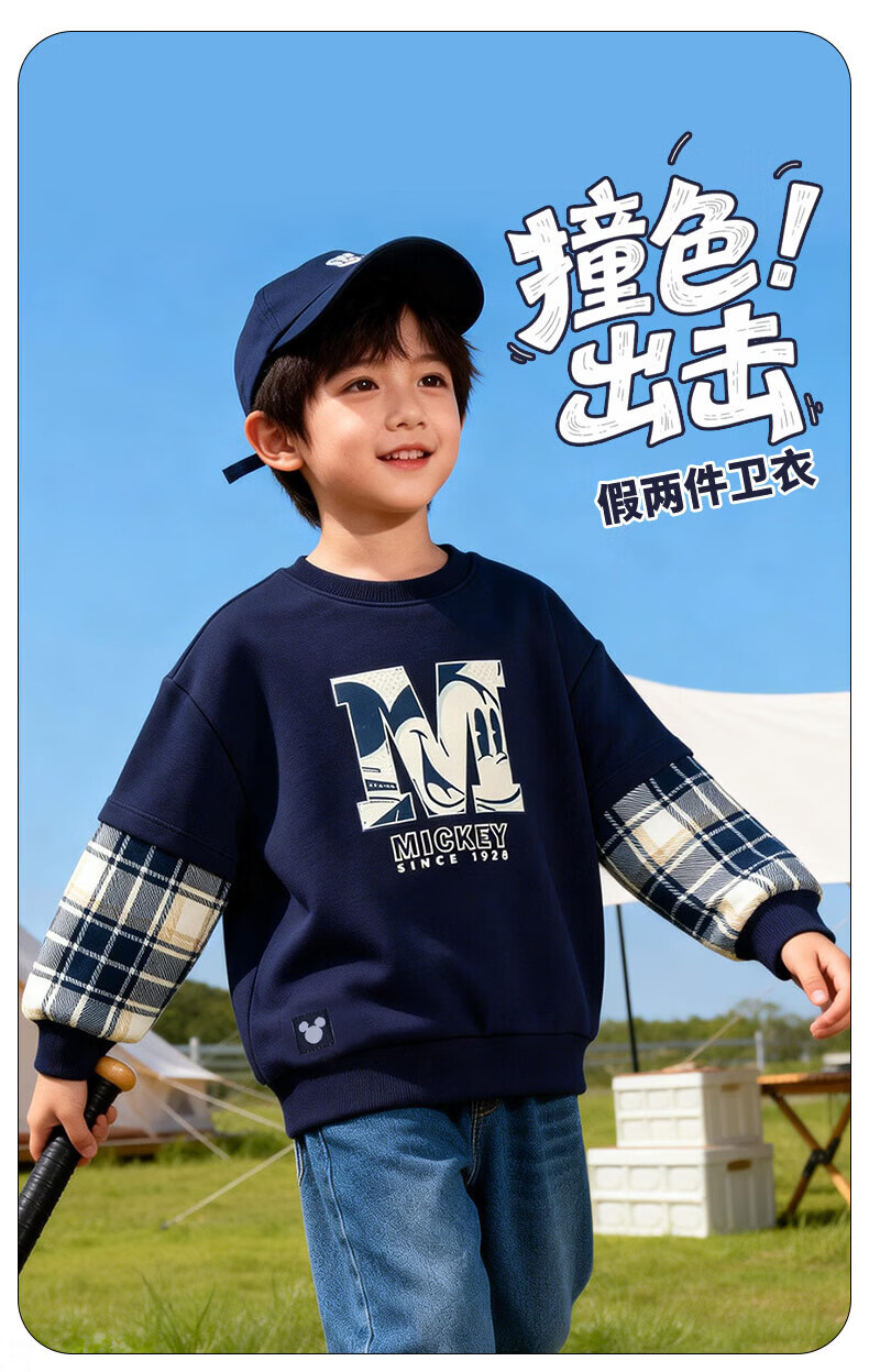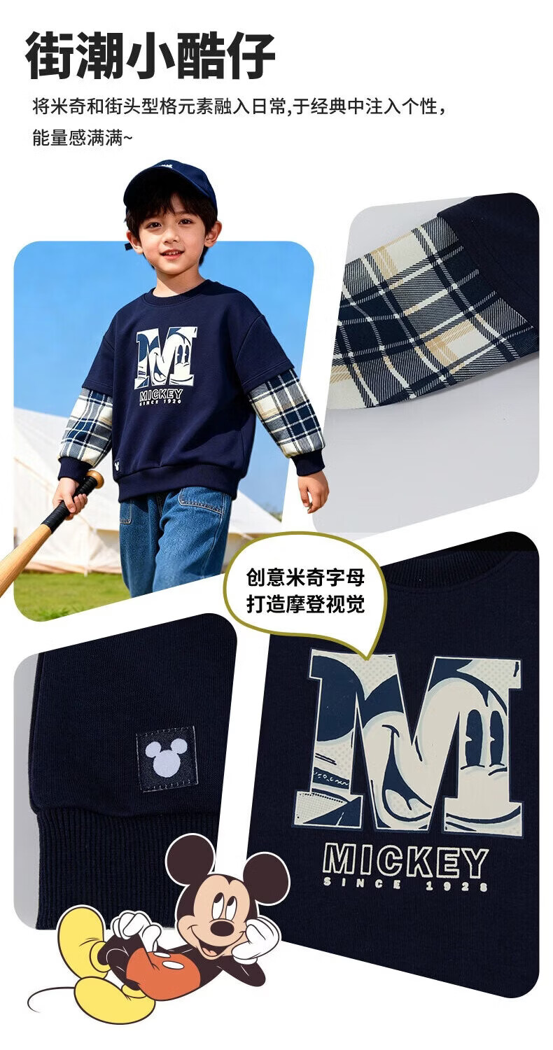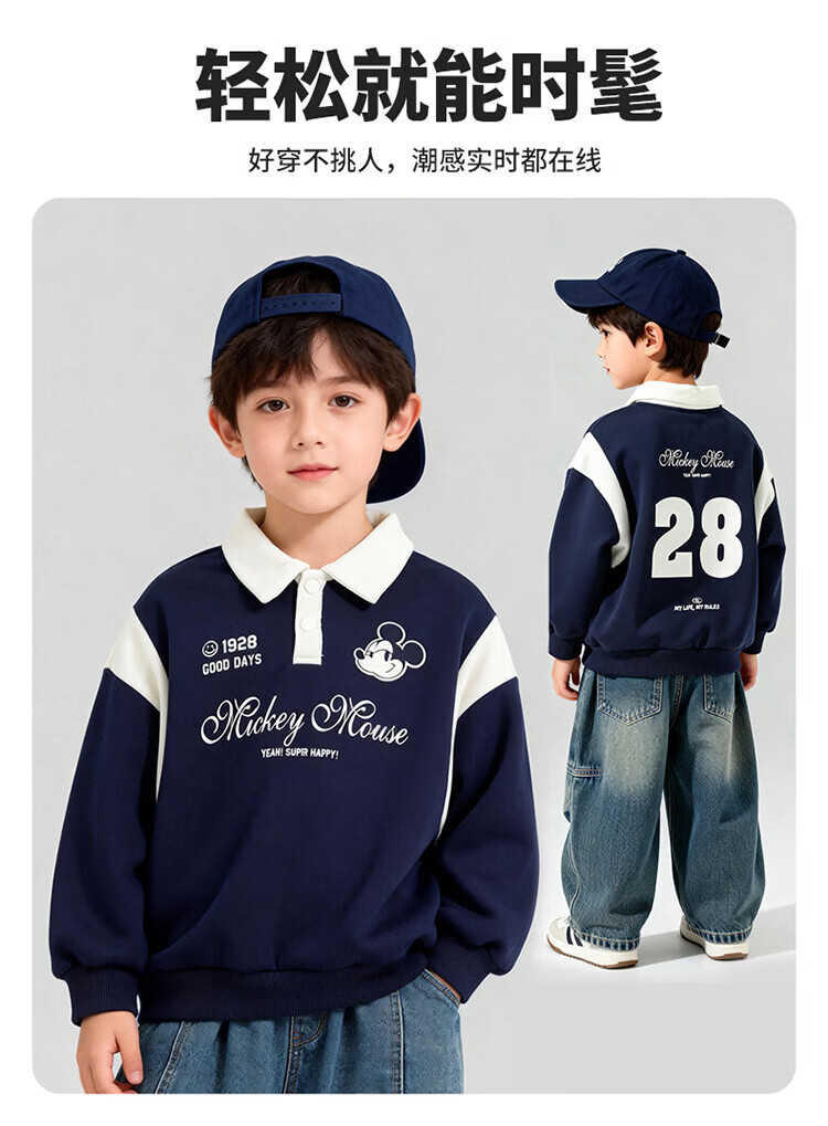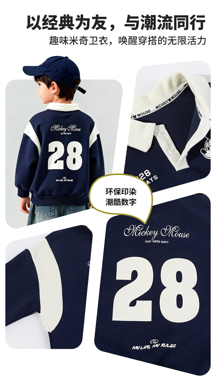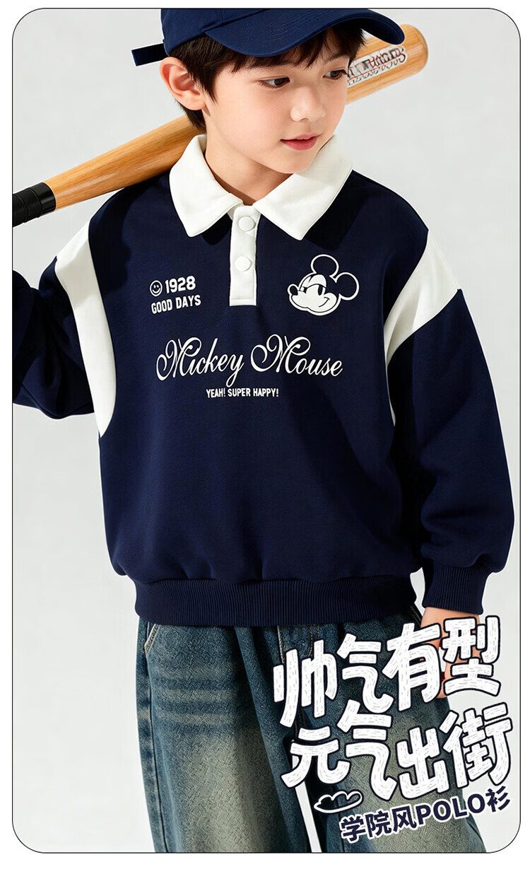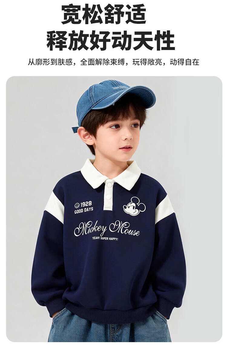 迪士尼(Disney)男童休闲运动耐磨卫衣春秋季学院风潮酷穿搭童装拼色卫衣26年新款 藏青Polo领 150 (建议10-12岁身高140-150cm)