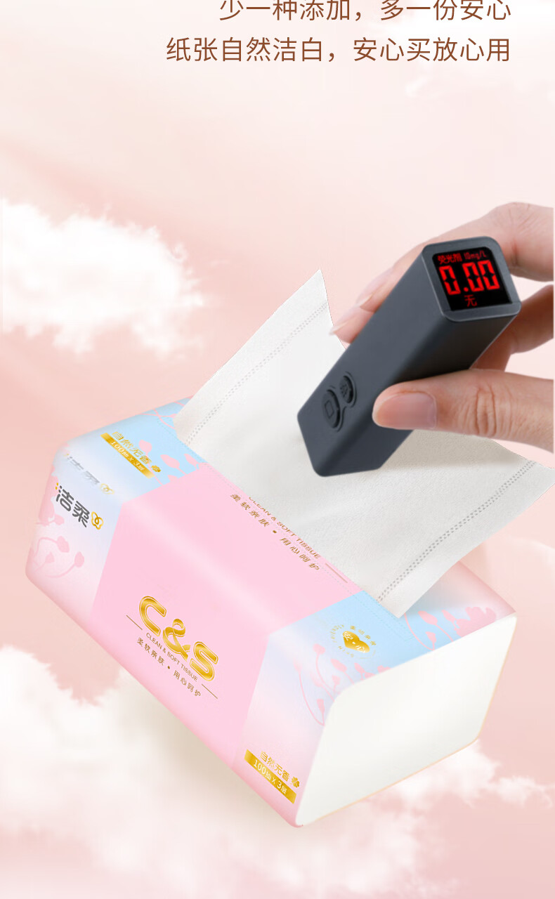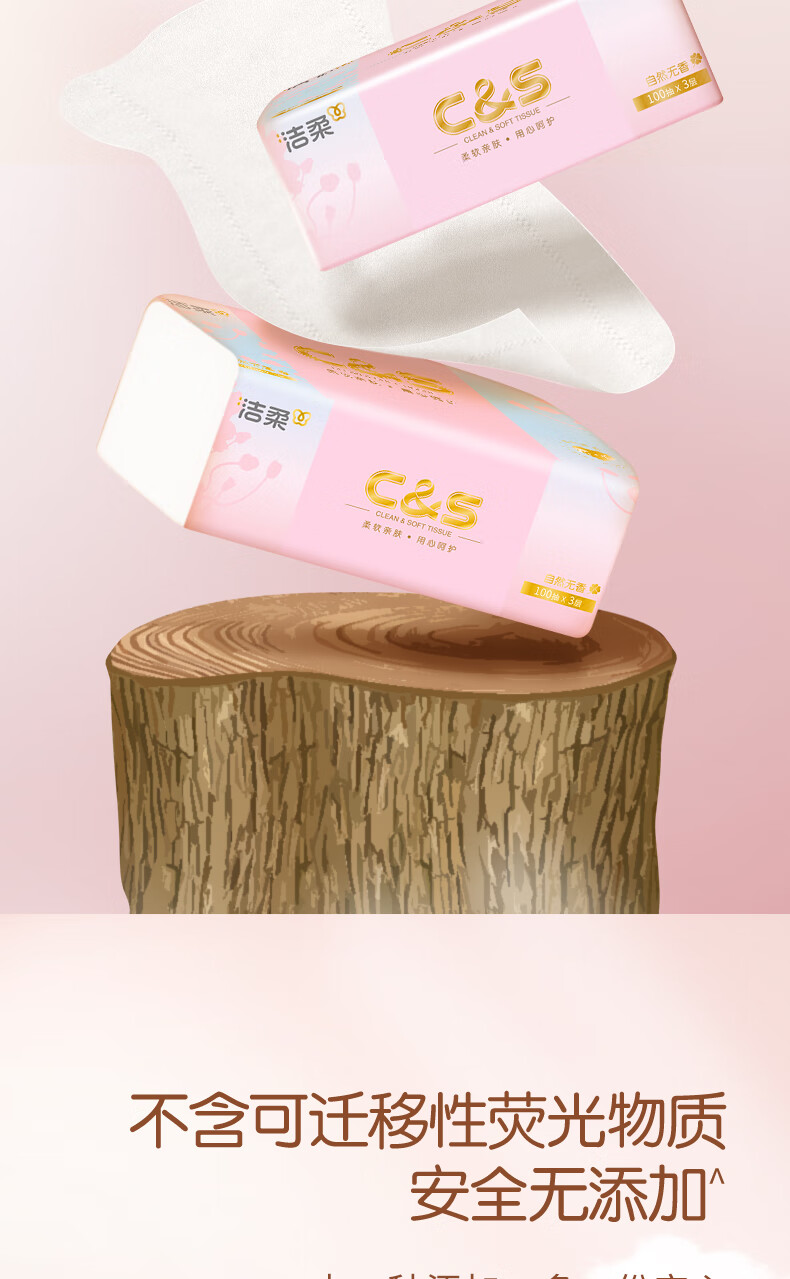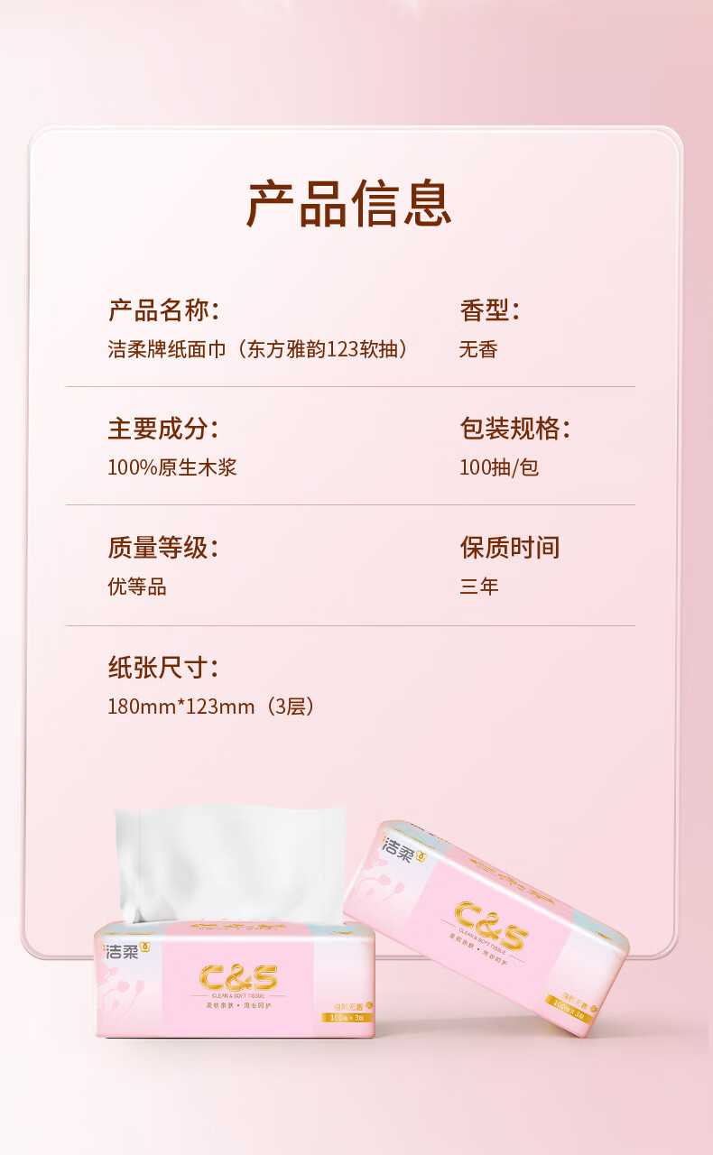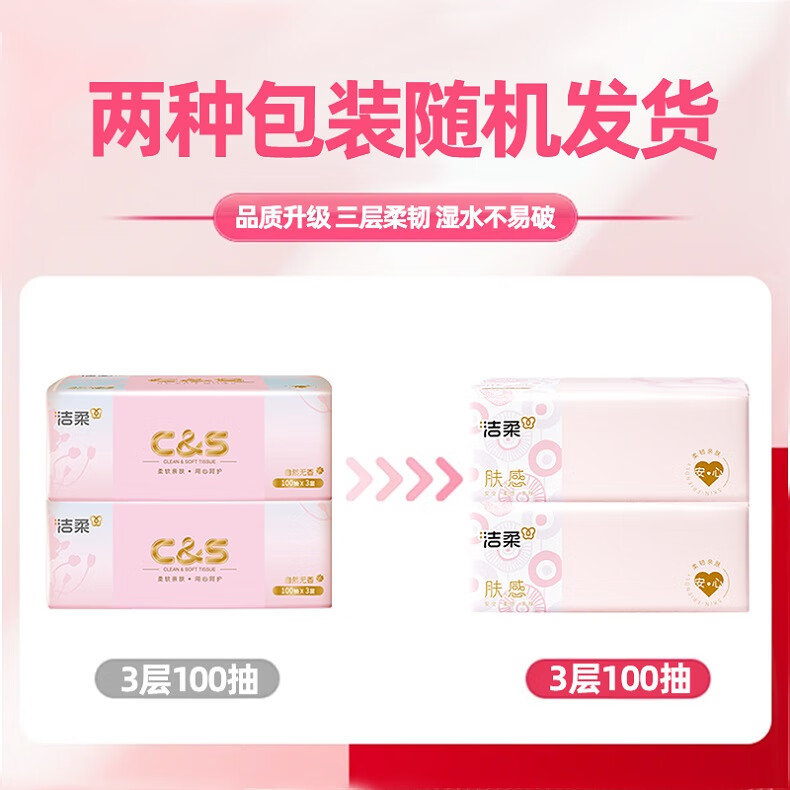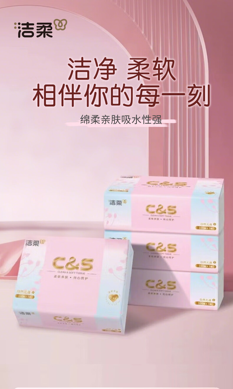洁柔抽纸 3层100抽无香卫生纸 家用餐巾纸原生木浆纸巾湿水不易破 3层 100抽*2包