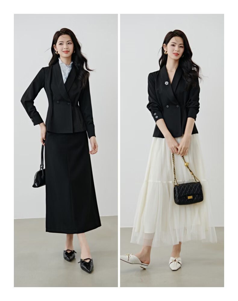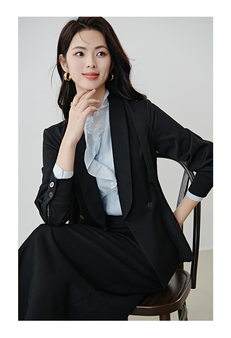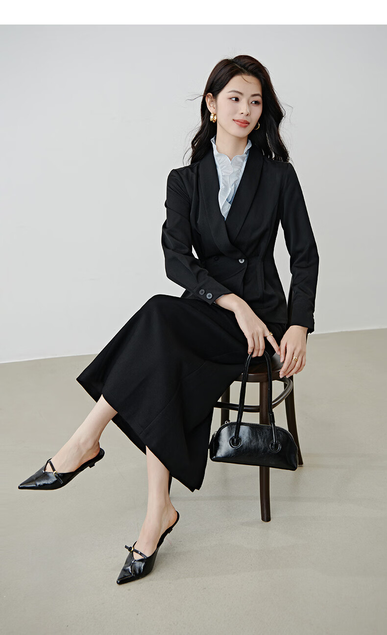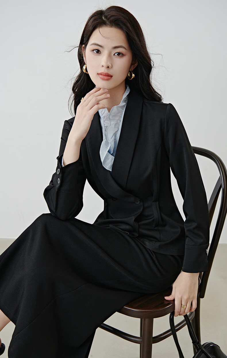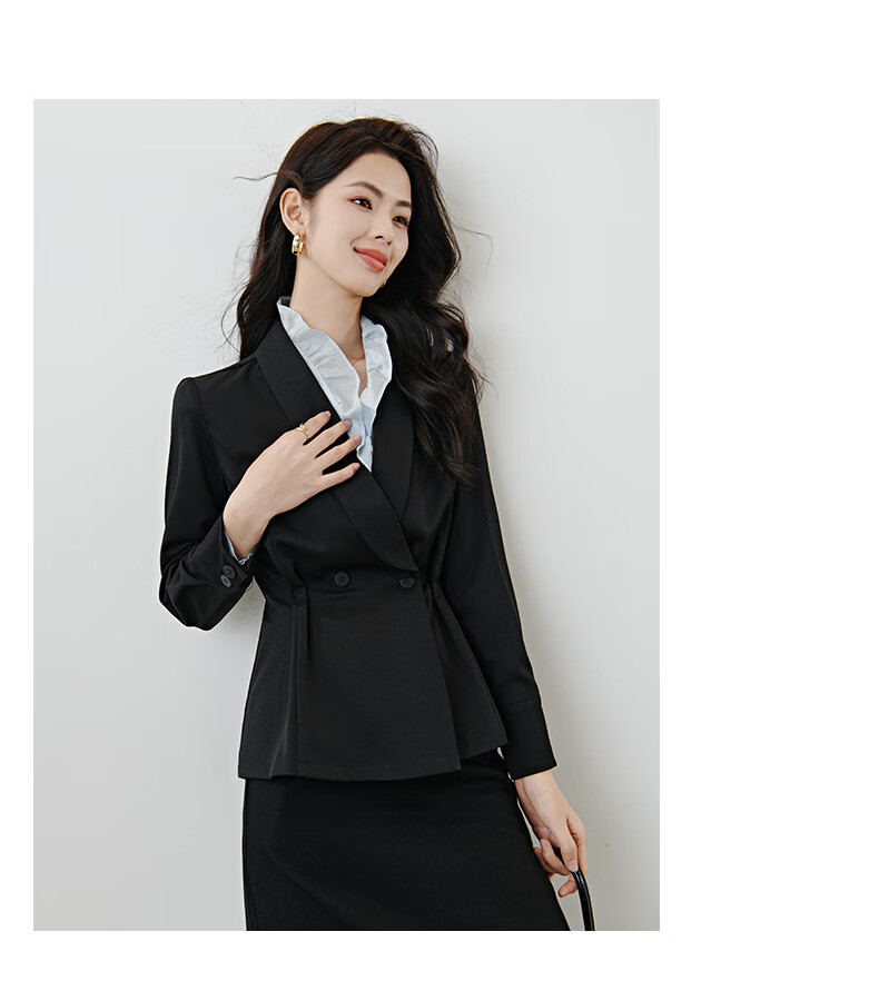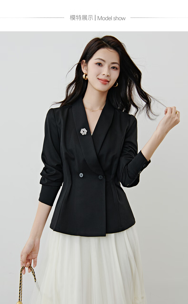 晚白2026春款高级感设计师款翻驳领西装利落收腰显瘦衬衫袖通勤外套女 黑色 S