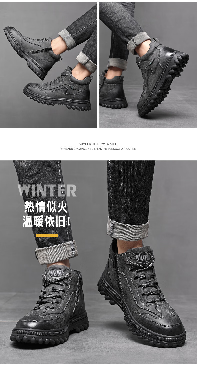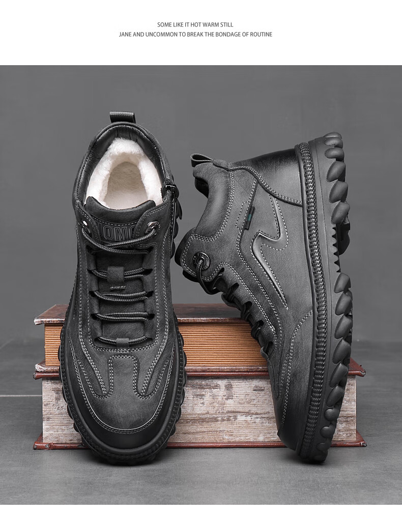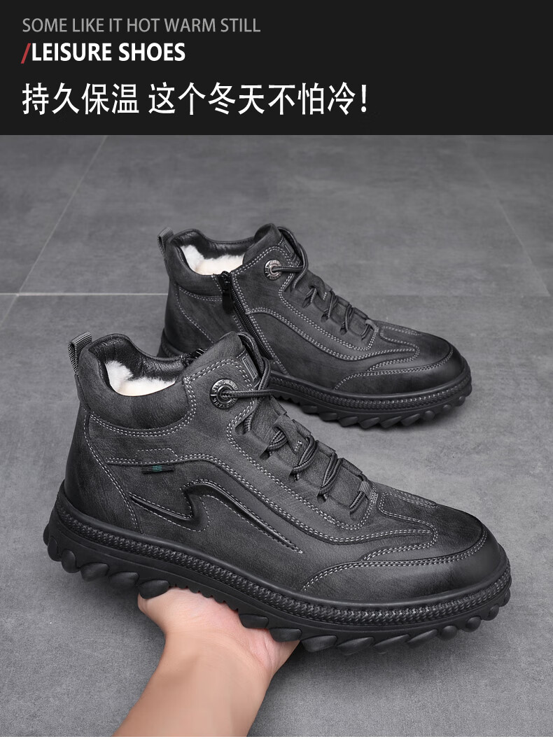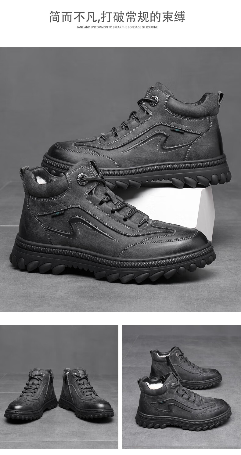 稻草人(MEXICAN)男士棉鞋真皮羊毛加绒加厚高帮休闲棉皮鞋防滑保暖男鞋冬季雪地靴 黑灰色 40