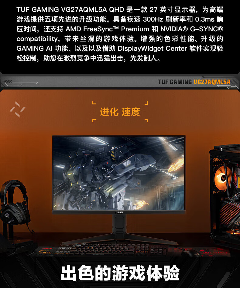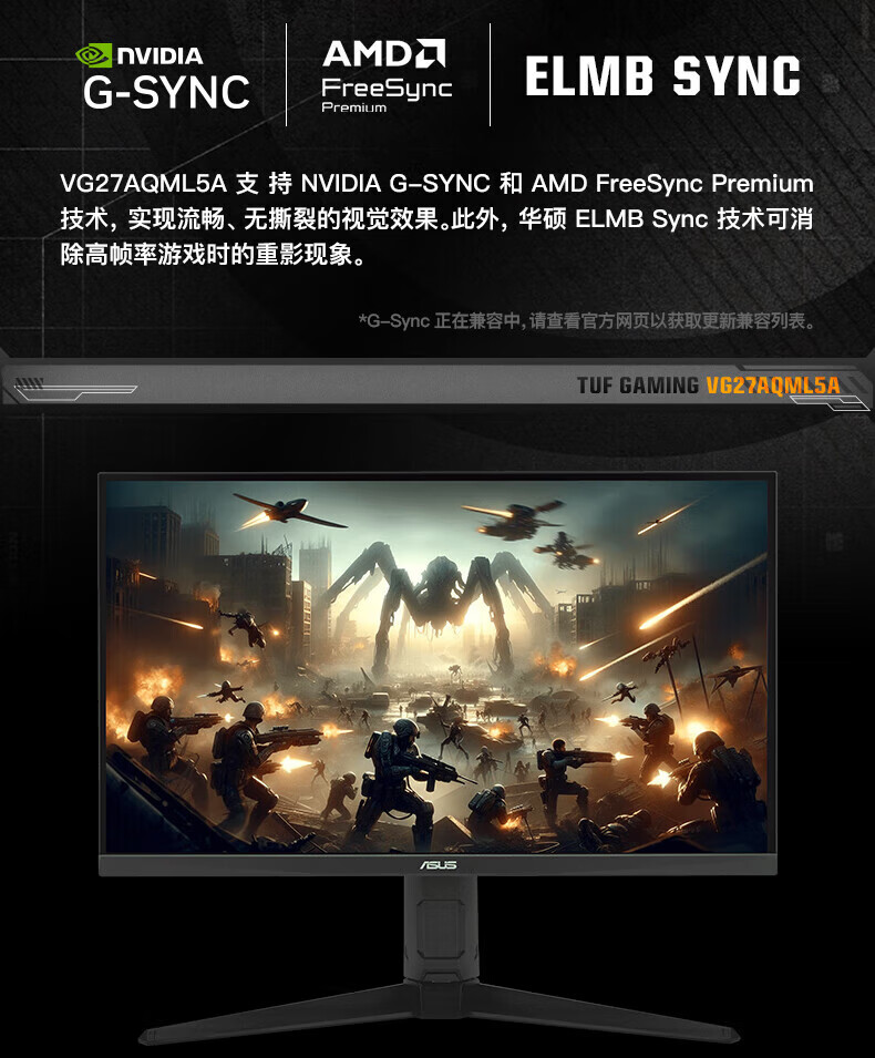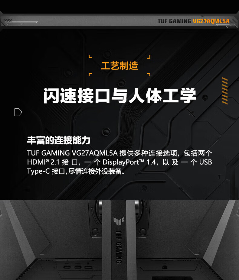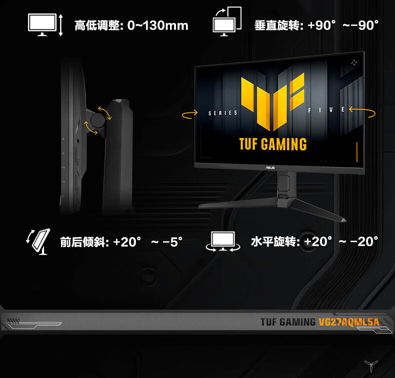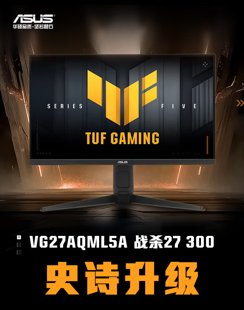 华硕(ASUS)TUF VG27AQML5A小金刚 27英寸2K显示器 高刷电竞 FastIPS显示屏 0.3ms响应 内置双音箱 G-sync升降 VG279QM5A【240Hz 27英寸】