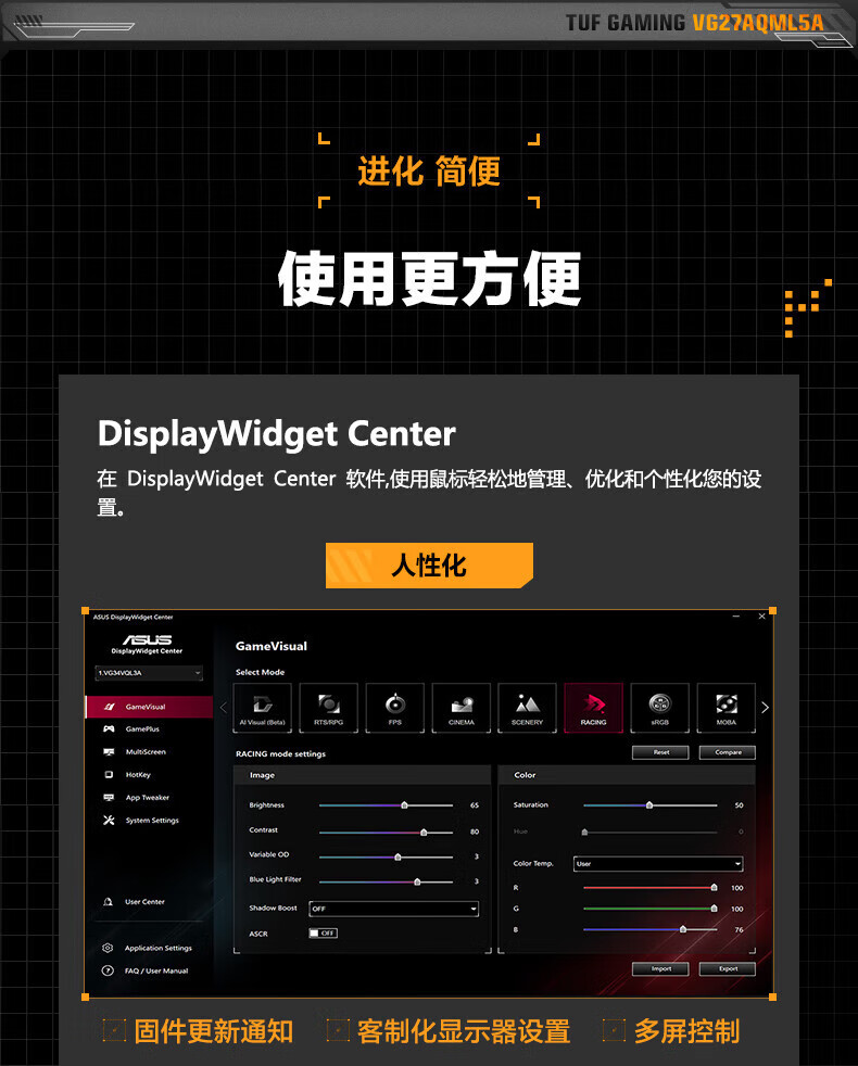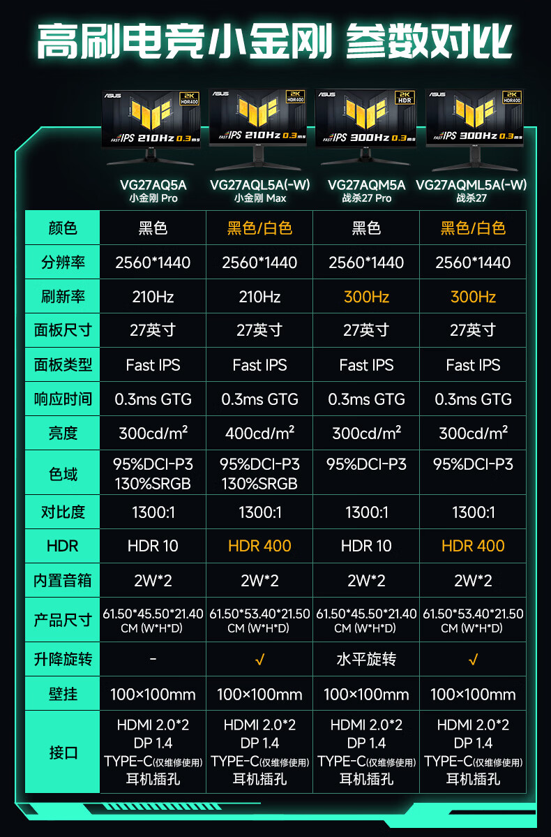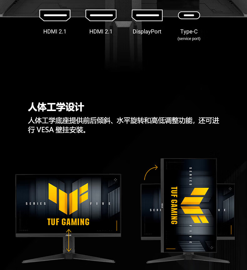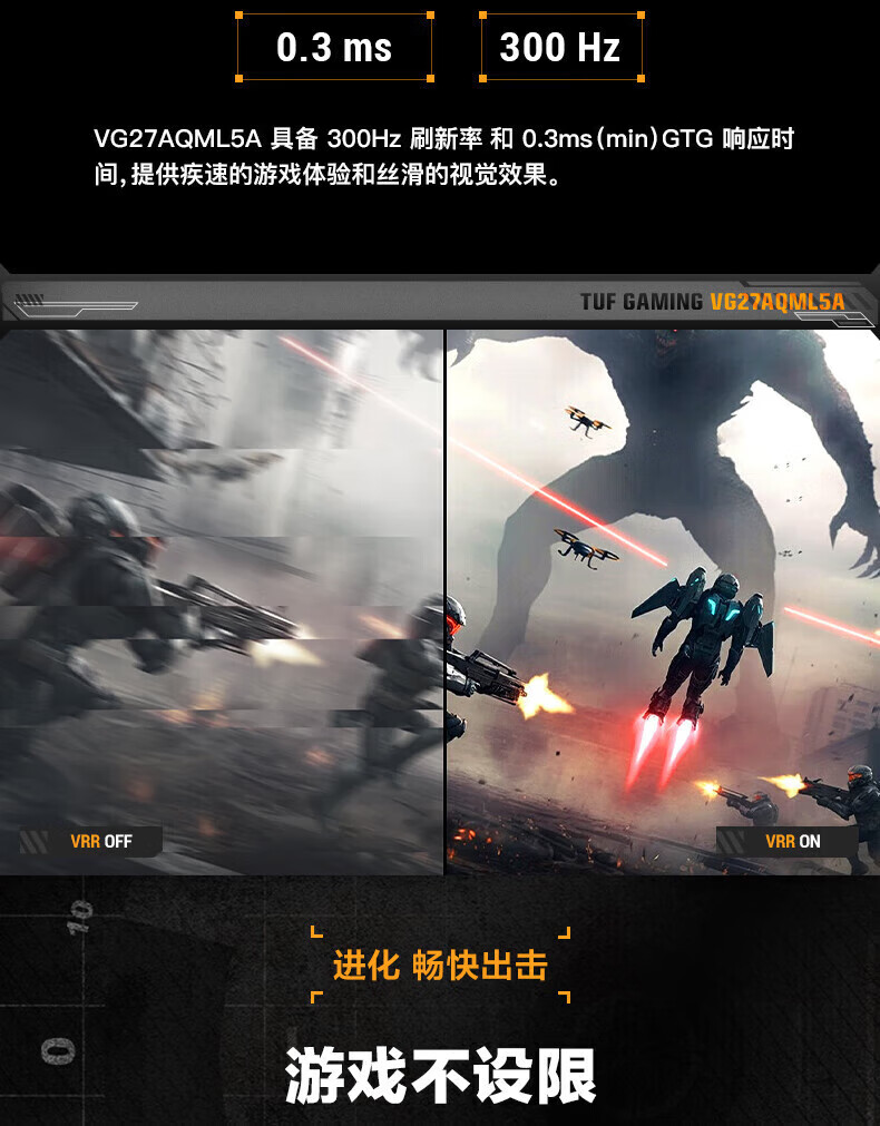 华硕(ASUS)TUF VG27AQML5A小金刚 27英寸2K显示器 高刷电竞 FastIPS显示屏 0.3ms响应 内置双音箱 G-sync升降 VG279QM5A【240Hz 27英寸】