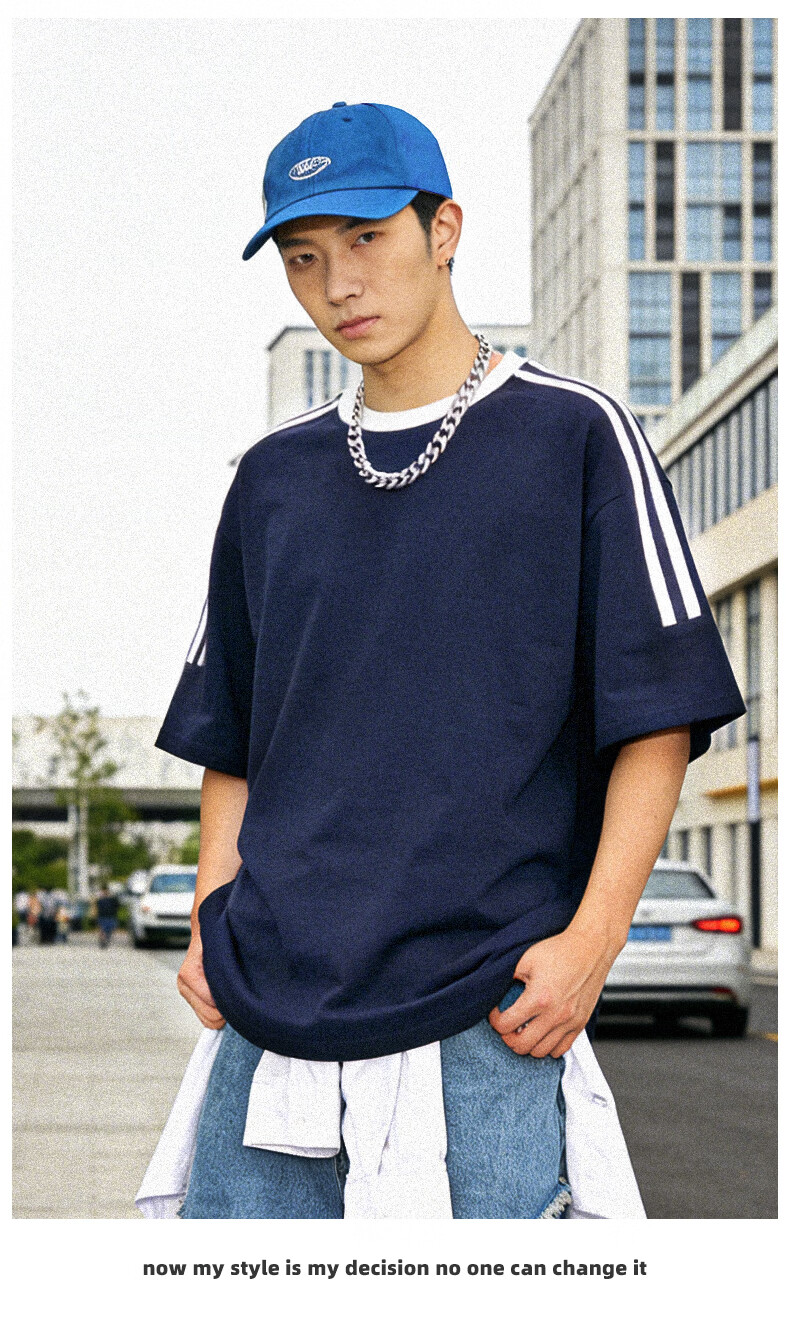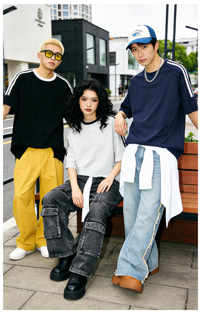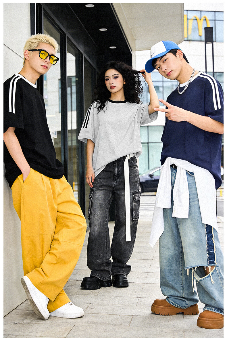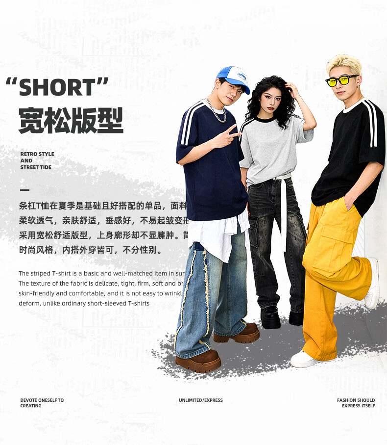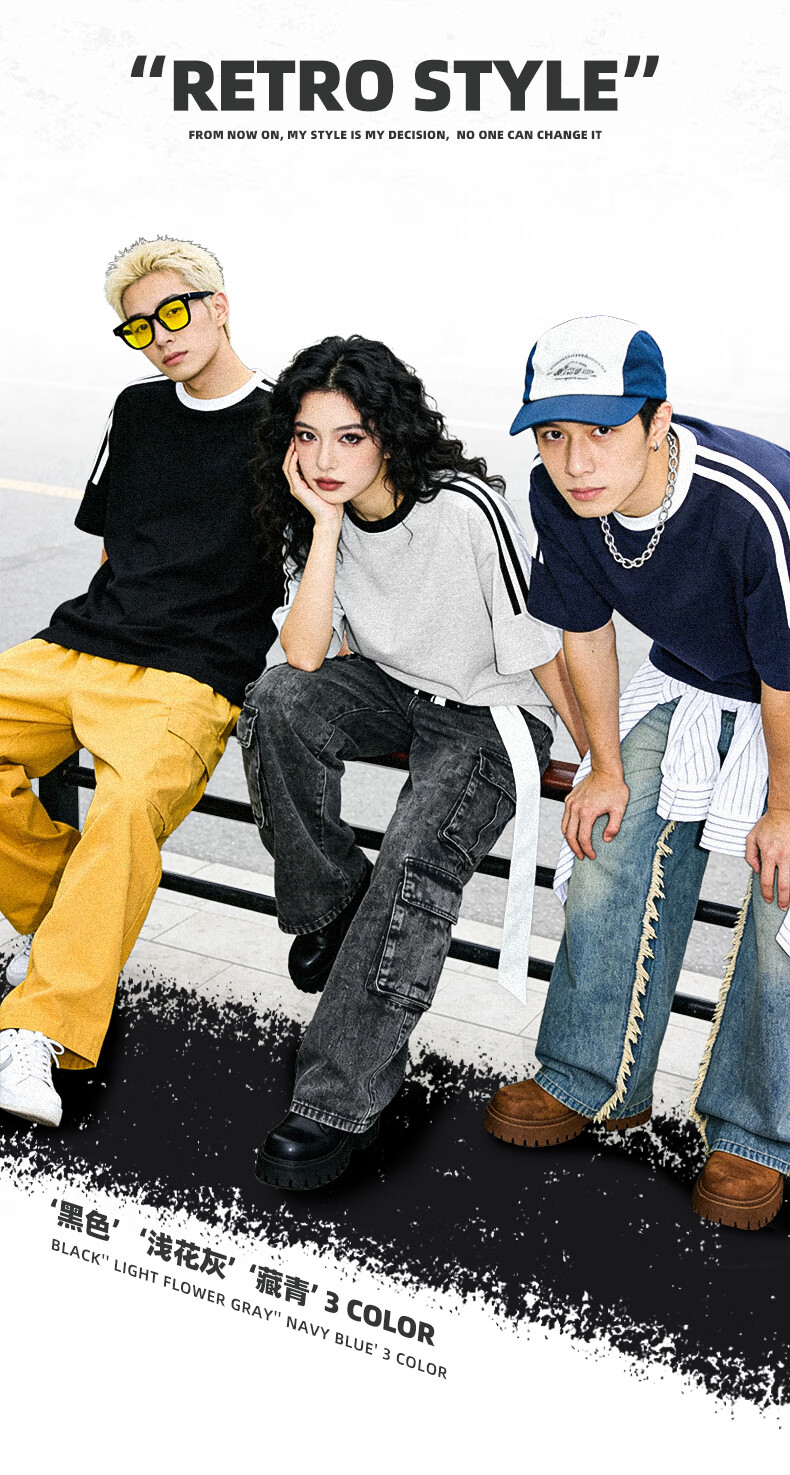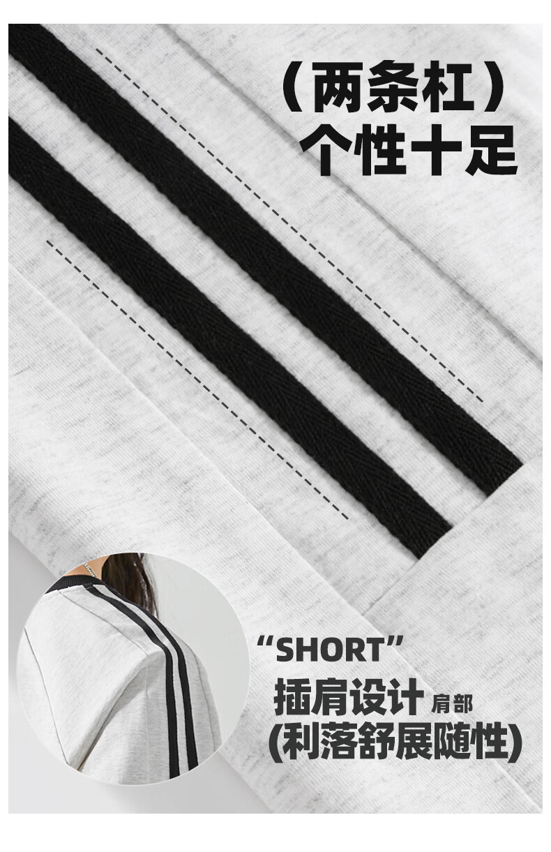 真维斯(Jeanswest)美式复古两条杠短袖t恤男女款夏季潮牌纯棉宽松百搭情侣半袖上衣 浅花灰 灌篮小宇 S