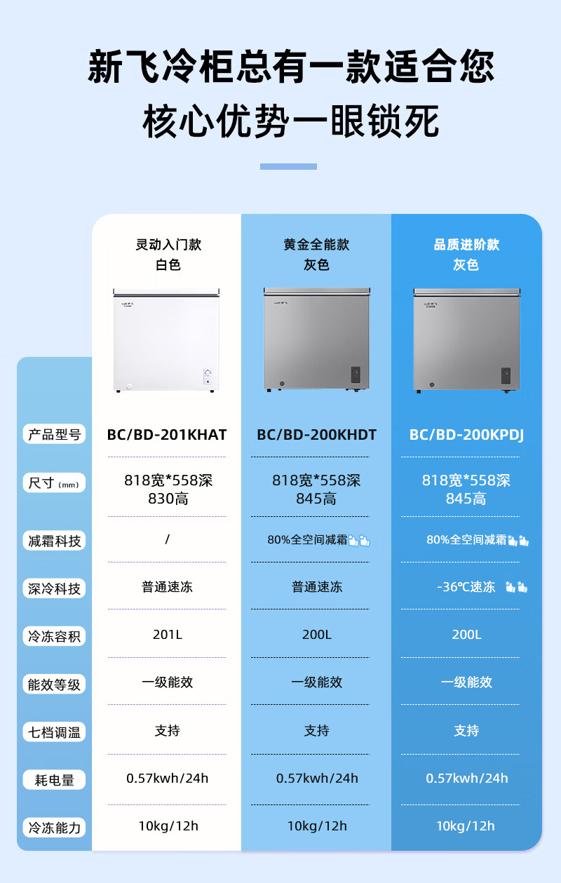 新飞201L单温家用冷柜一级冷藏冷冻两用卧式冰柜节能省电宽幅变温小冰箱BC/BD-201KHAT 国家补贴