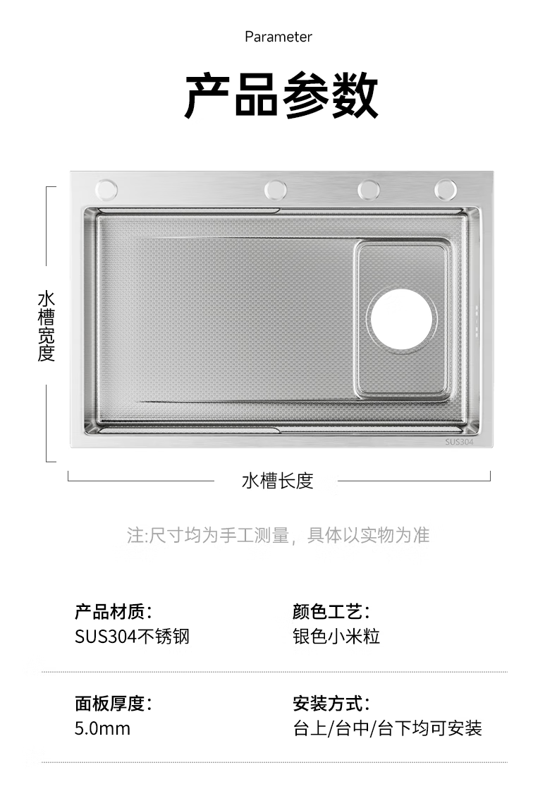 NOEO304不锈钢水槽单槽家用厨房洗菜盆洗碗池加厚米粒压纹集渣槽水池 60x45 | 不含龙头