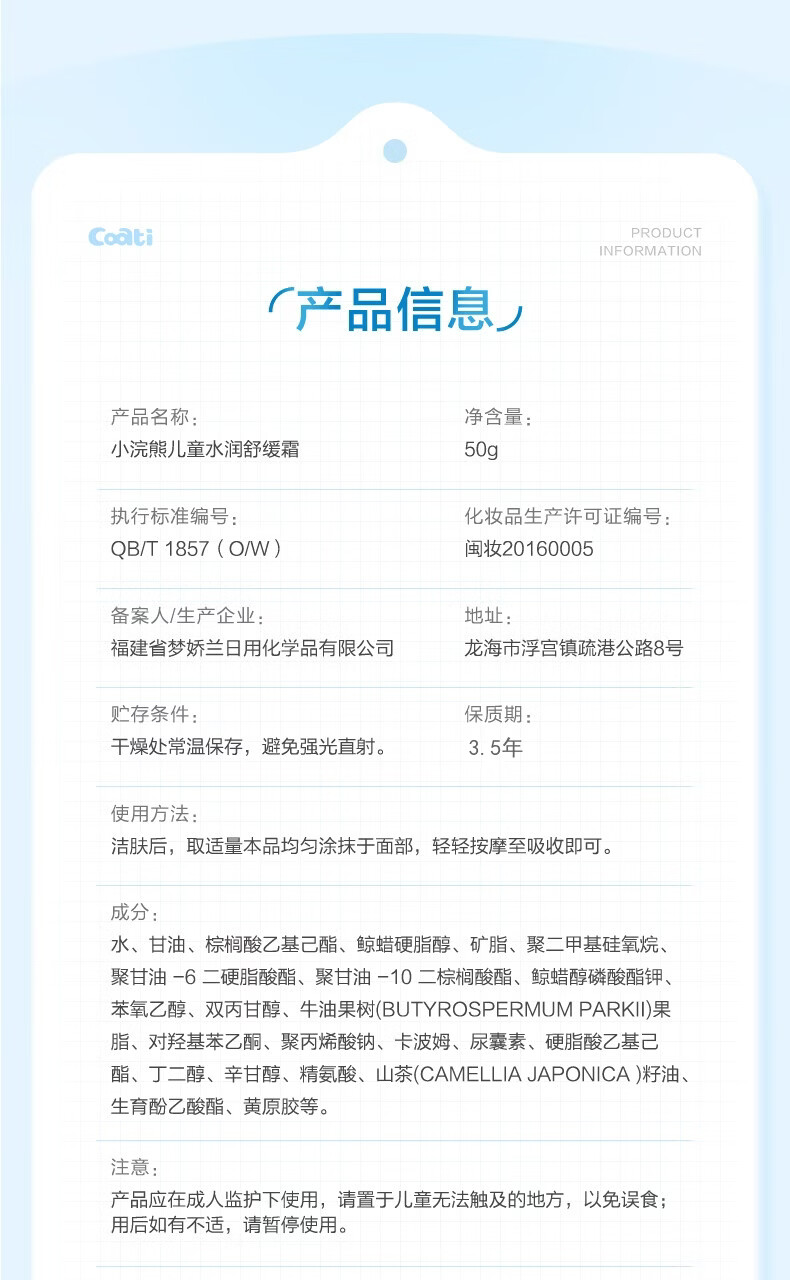 小浣熊儿童水润舒缓霜 婴儿滋润保湿面霜 宝宝四季舒缓润肤霜50g