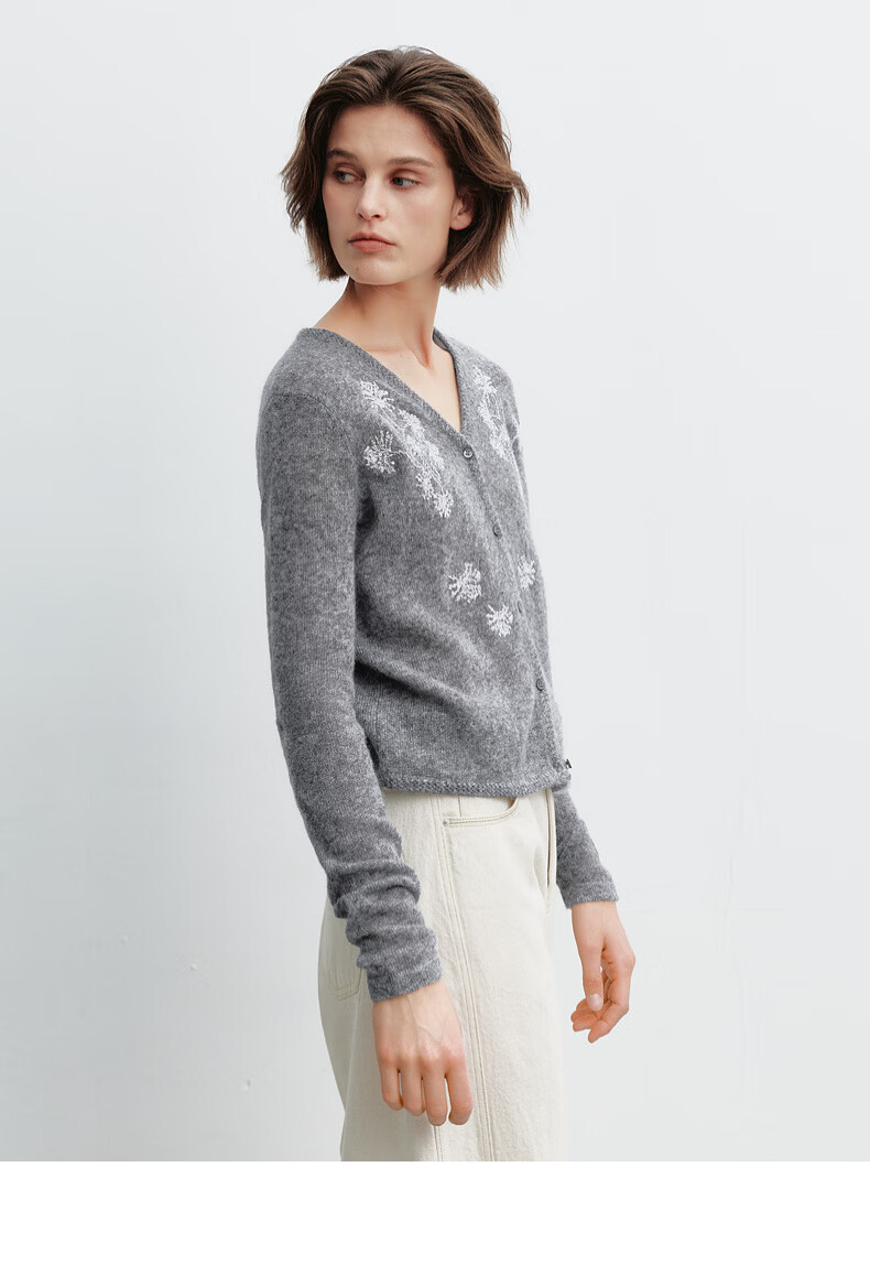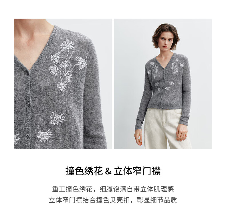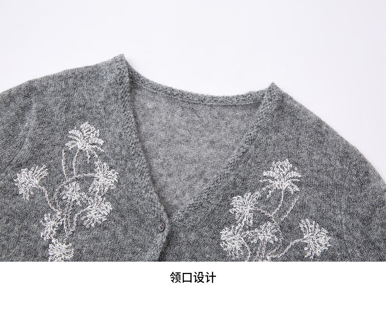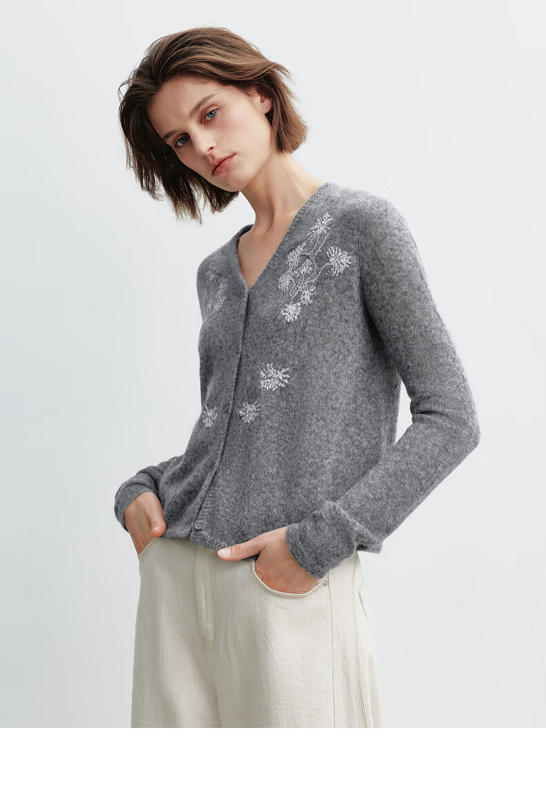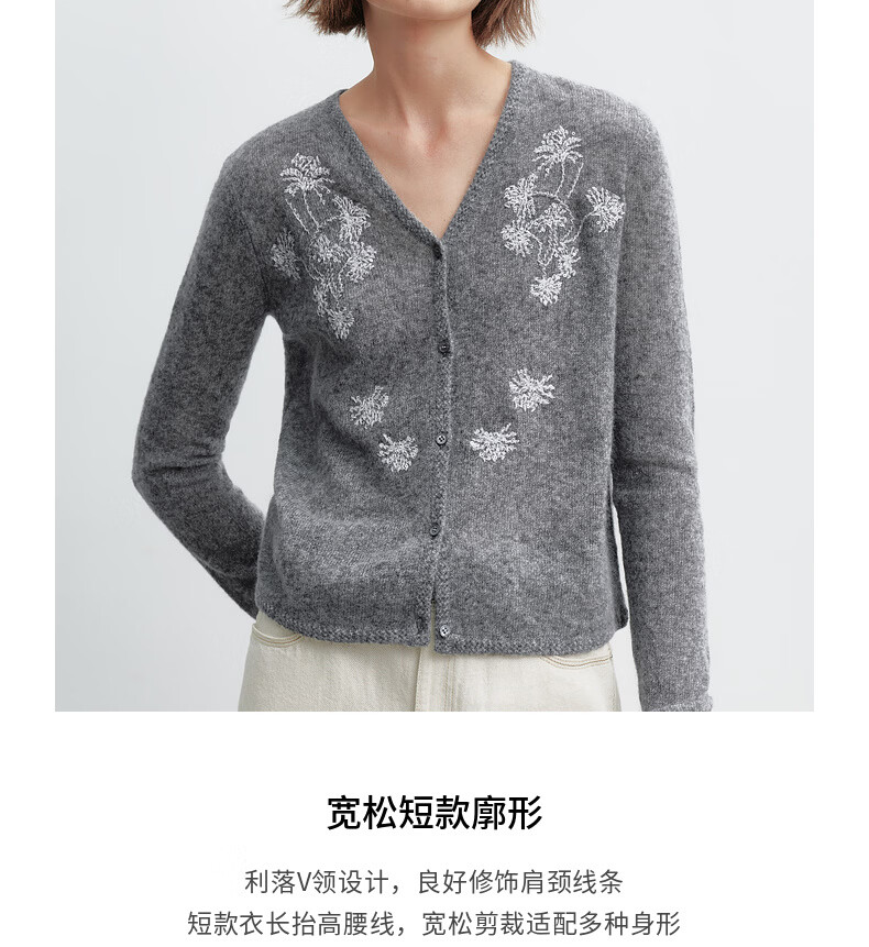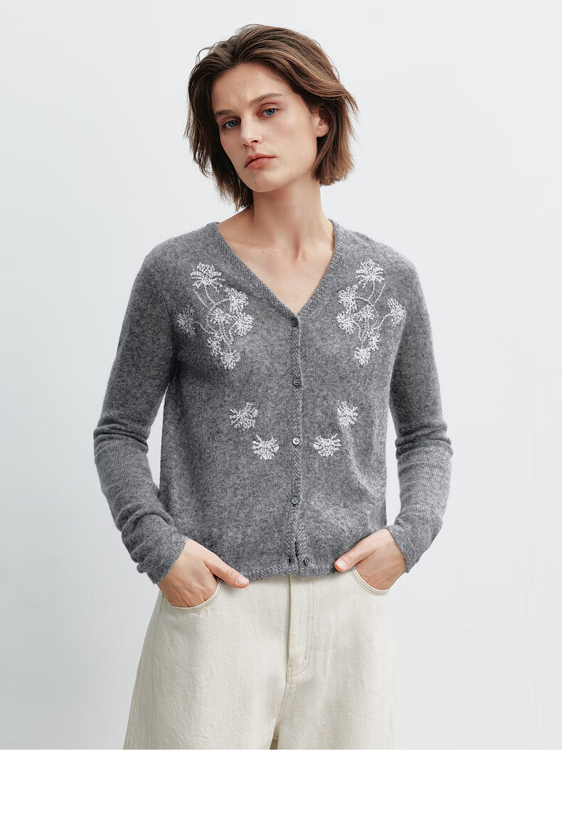 H's灰色针织开衫女26年春季新款高级设计感宽松廓形刺绣毛衣上衣 珍珠灰 S