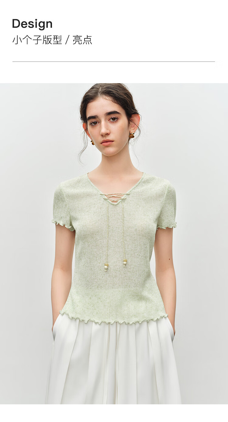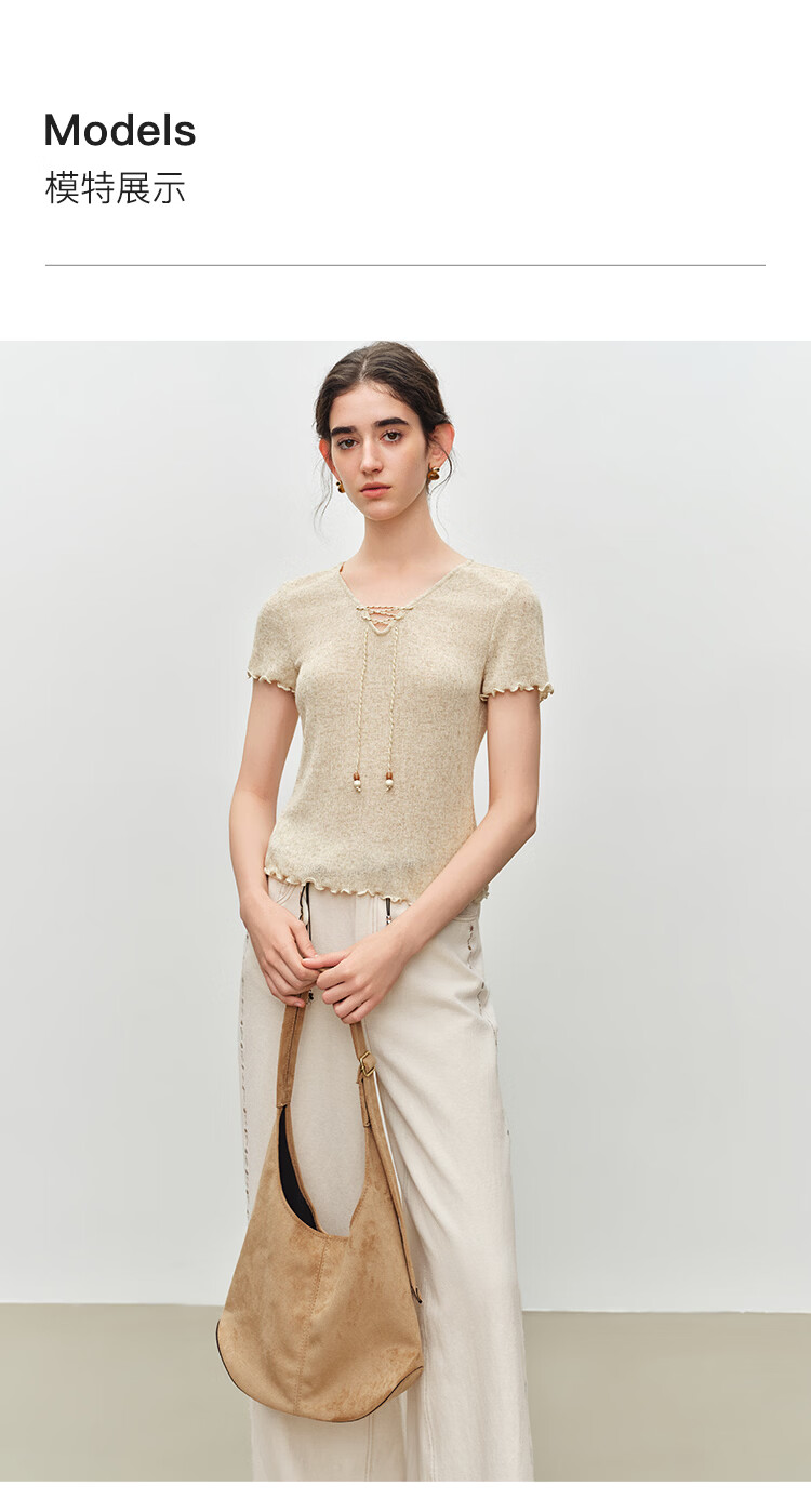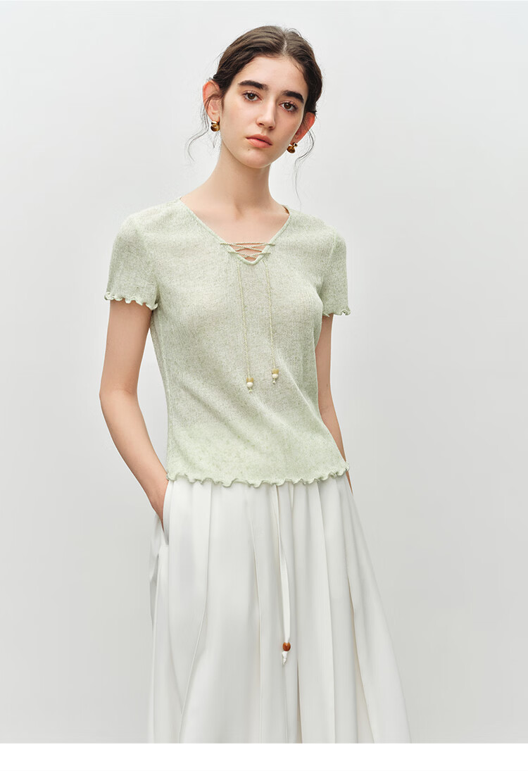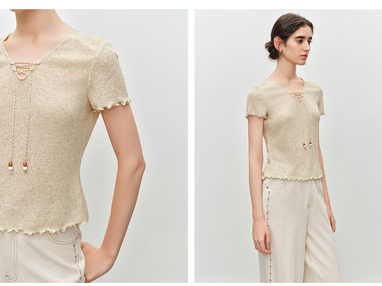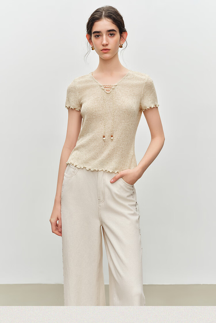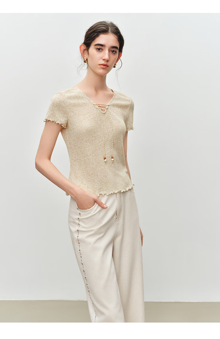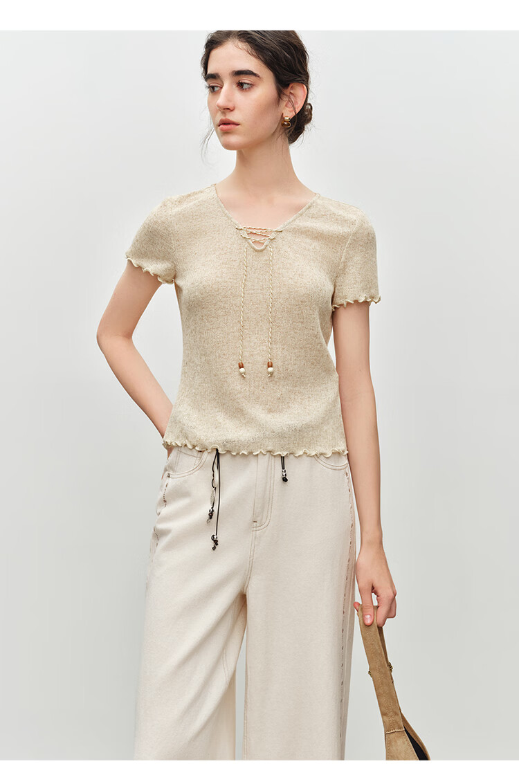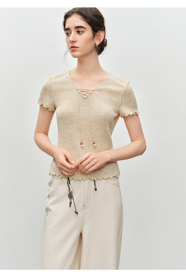 自巧小个子波嬉风串珠系带v领修身针织t恤女2026夏季新款短袖上衣 燕麦色 XXS (尺码:1)