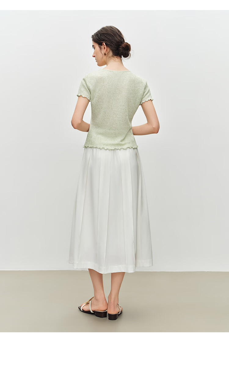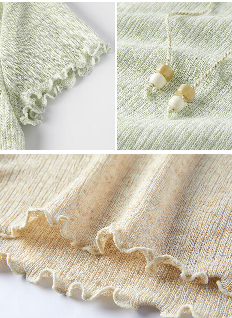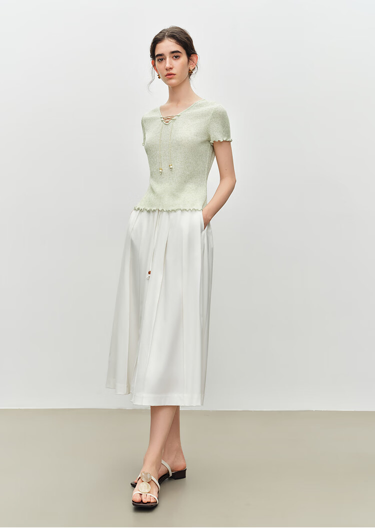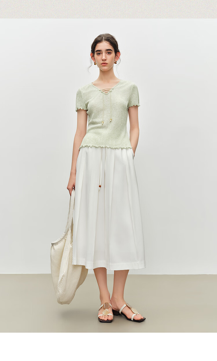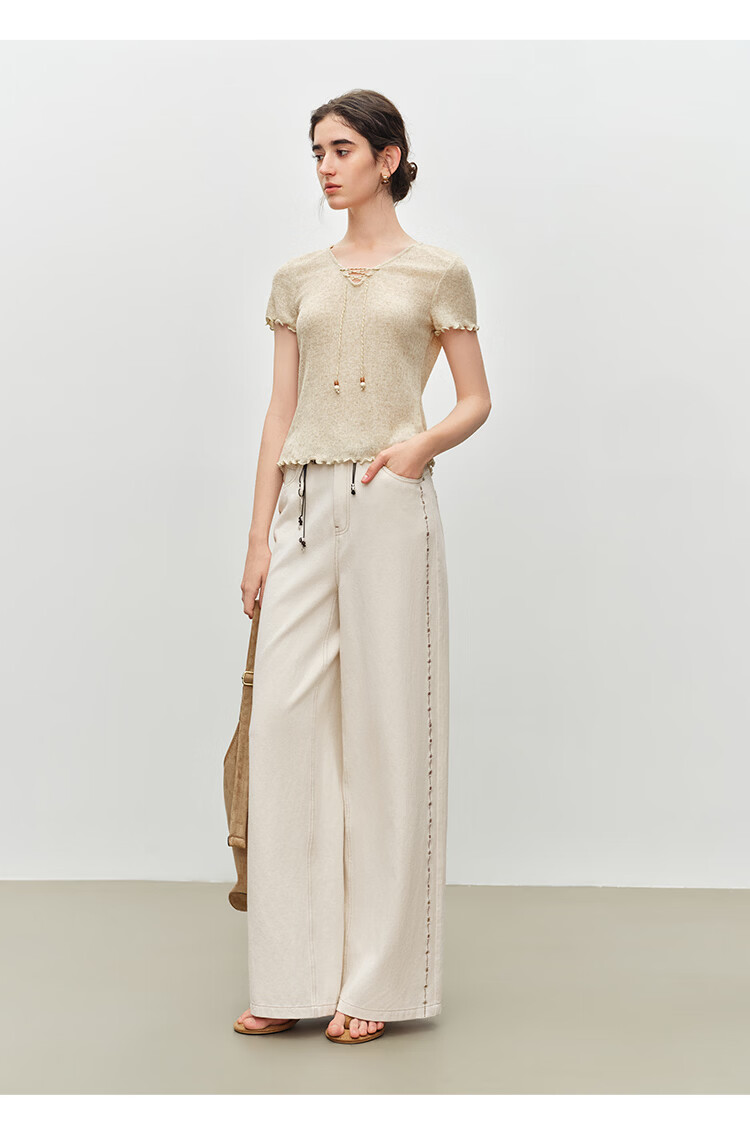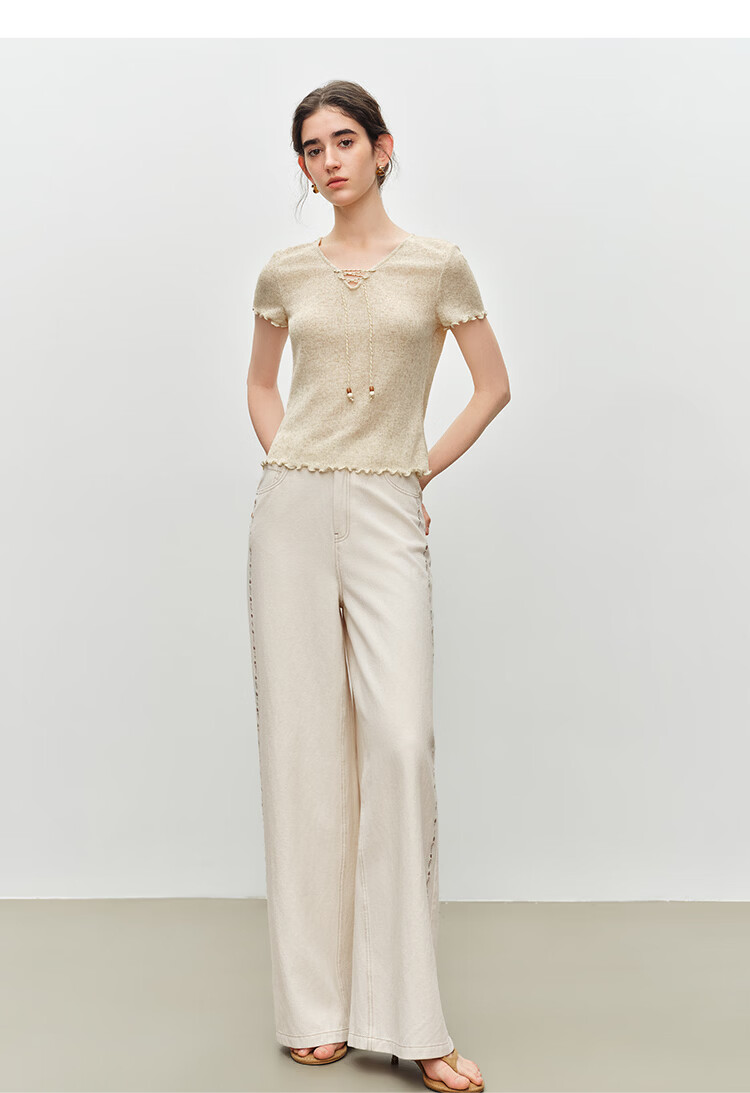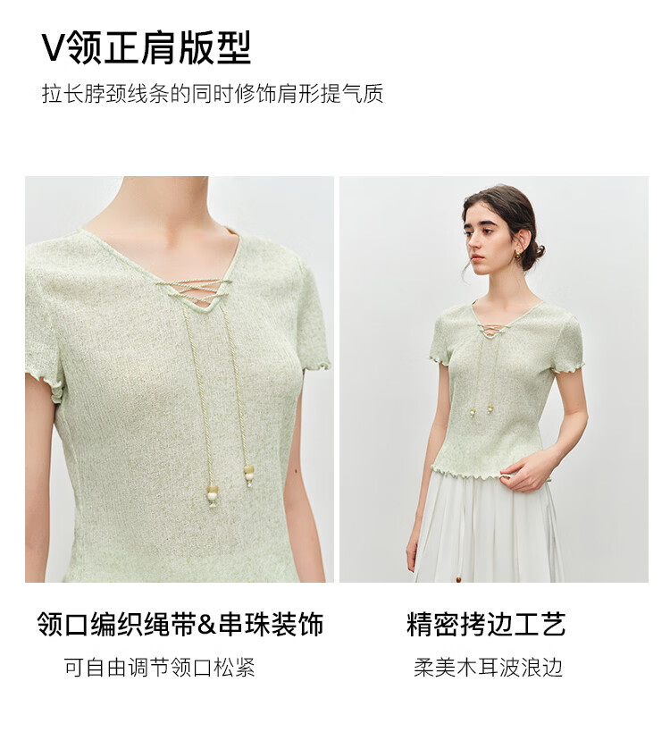 自巧小个子波嬉风串珠系带v领修身针织t恤女2026夏季新款短袖上衣 燕麦色 XXS (尺码:1)