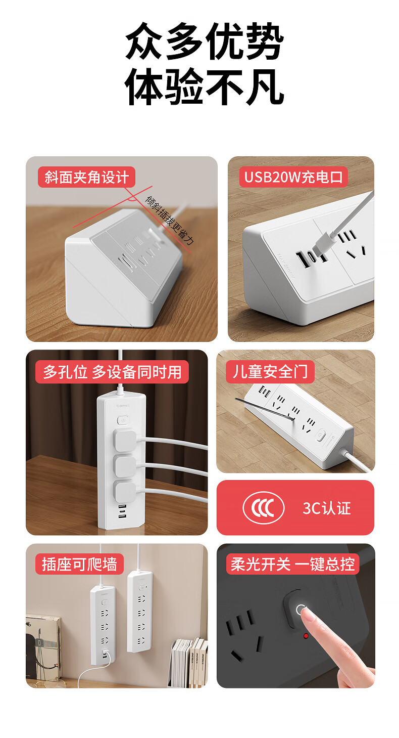 国际电工新国标插座三角斜面设计快充USB插排多位插孔接线板办公家用排插 4位20孔 线长0.3米 【一键总控】