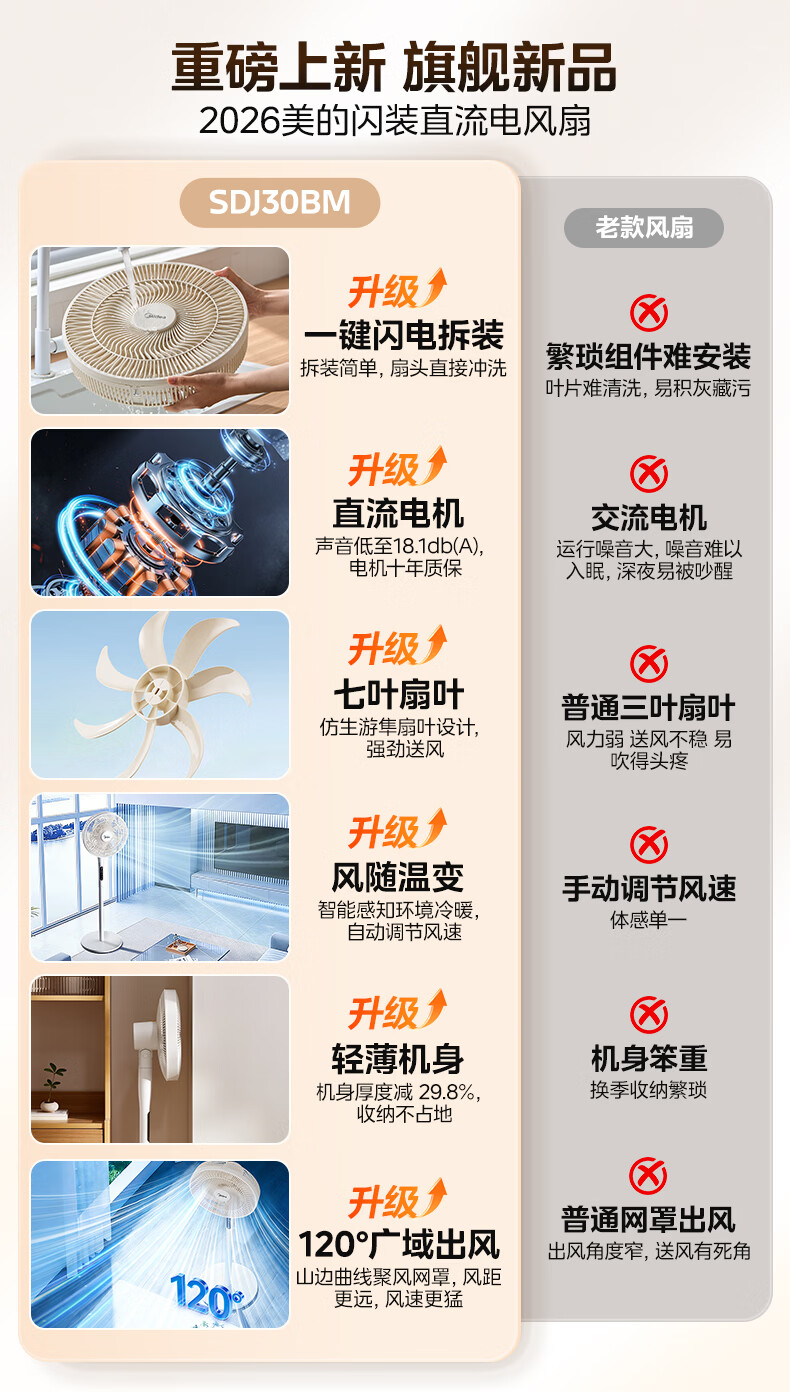 美的(Midea)【一键闪装】电风扇 家用立式一级能效变频直流落地扇卧室客厅大风力轻音低噪小型风扇 SDJ30BM